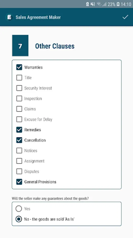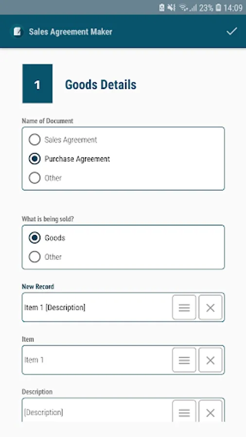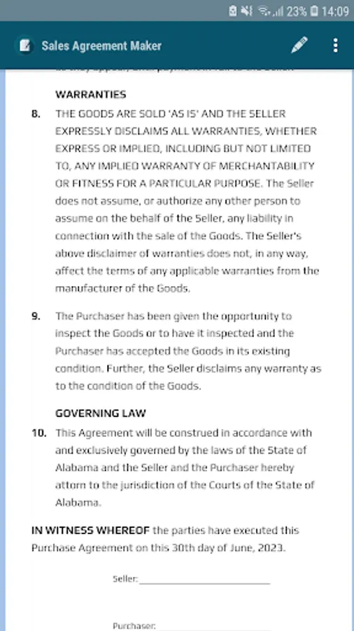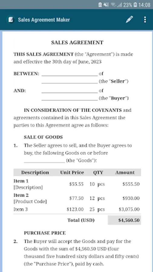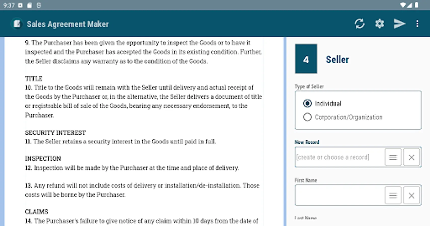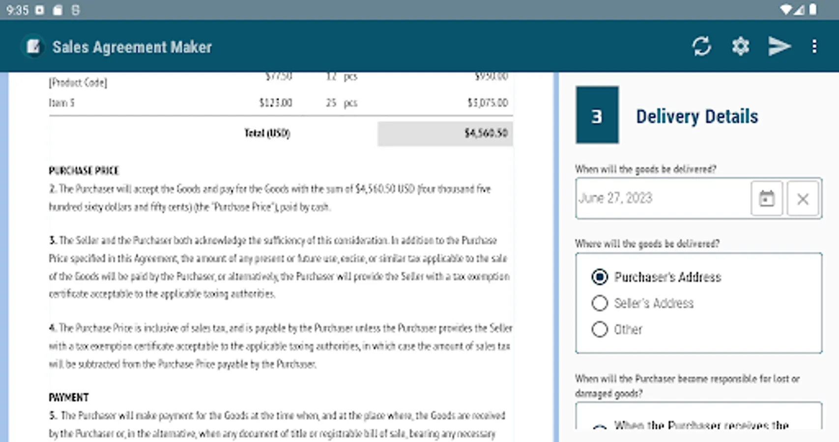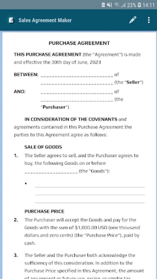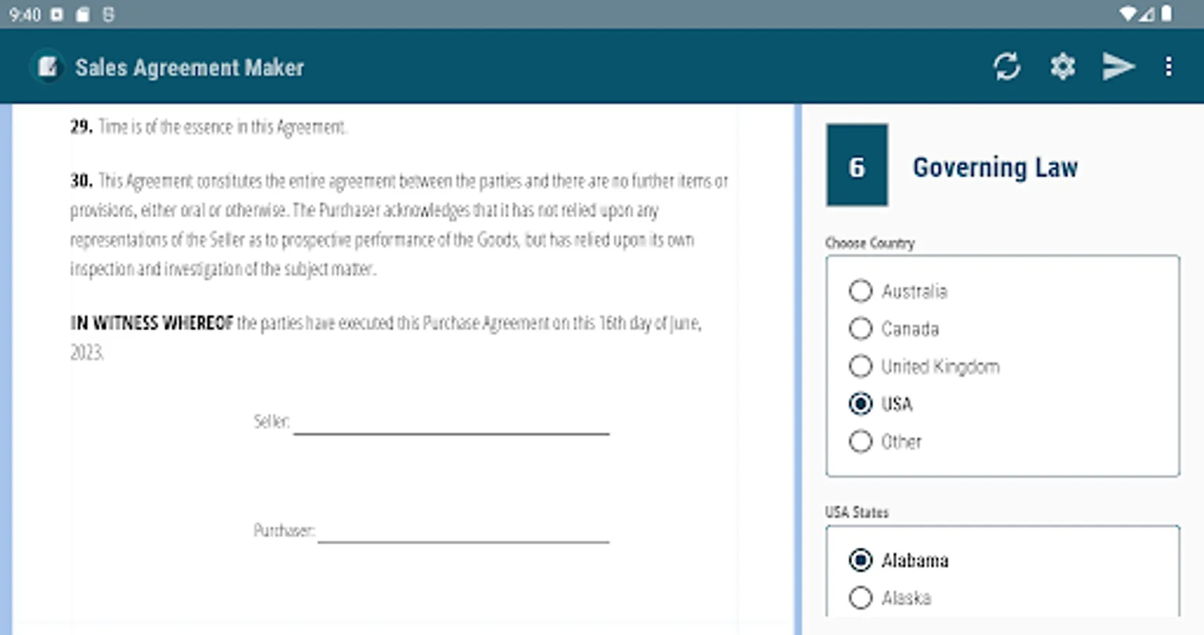 The Sales Agreement App uses the automated agreement form (contract template) for drawing the Sales Agreement or Purchase Agreement forms. This Sales Contract or Sale of Goods Contract application allows a seller or a buyer (purchaser) to document the sale of goods transaction. The Sales Agreement Maker automatically changes the text of the contract using a contract template in which the user selects the necessary options. The contract template saves all entered data between working sessions.