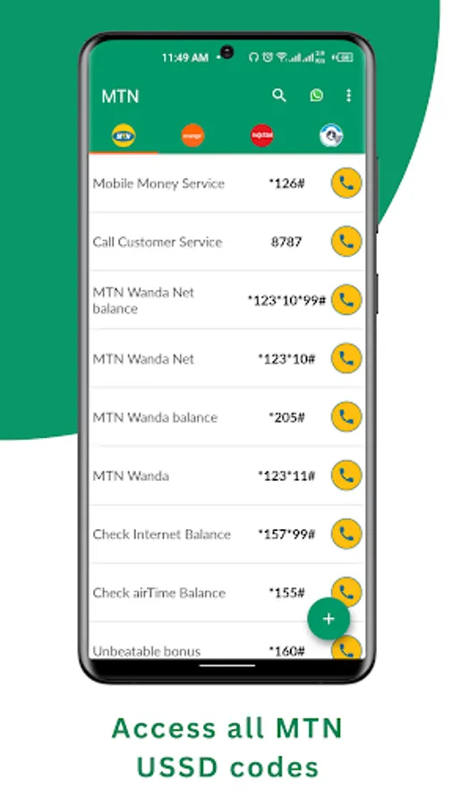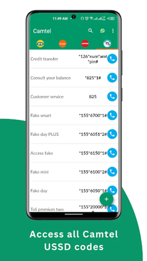 CamCodes is a mobile application that will help you to easy dial a USSD code from any network operator in Cameroon(MTN, Orange, Nexttel, Camtel). CamCodes is designed in four tabs, each representing the various network operators in Cameroon(MTN, Orange, Nexttel, Camtel). Each tab contains a list of all the short codes with an explanation of each code and a dial button which dials the corresponding short code. Fro instance, on the MTN tab you can find amazing service such as: MTN wanda service code, MTN wanda net service code, MTN mobile money service code, chekc MTN airtime balance short code, check MTN wanda balance, check MTN wanda net balance ussd code, subscribe to an MTN internet package, Get your MTN balance( in MB) which available internet, call MTN customer service code, MTN prolongation code, MTN extension code, send bipme to MTN contacts, borrow MTN airtime code, borrow internet data(in MB) from MTN, get balance of MTN prolongation code, get balance of MTN extension, transfer MTN airtime to any MTN contact, check your validity of your MTN SMS package, subscribe for an MTN SMS package and a lot more.