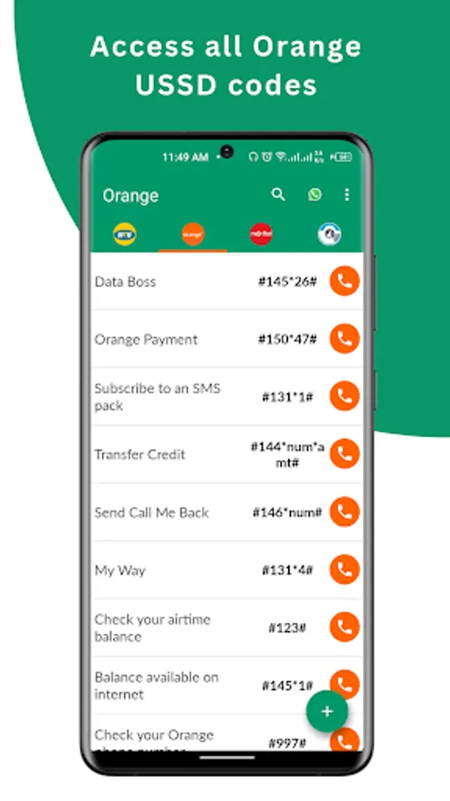 With the orange tab, CamCodes has amazing features such as: Orange my way code, Orange money code, Orange internet service code, check your Orange airtime balance code, code to know your orange number, call Orange customer service number, send call me back with Orange, subscribe to an orange SMS package, international call package, reload credit card, voice messaging, and a lot more.