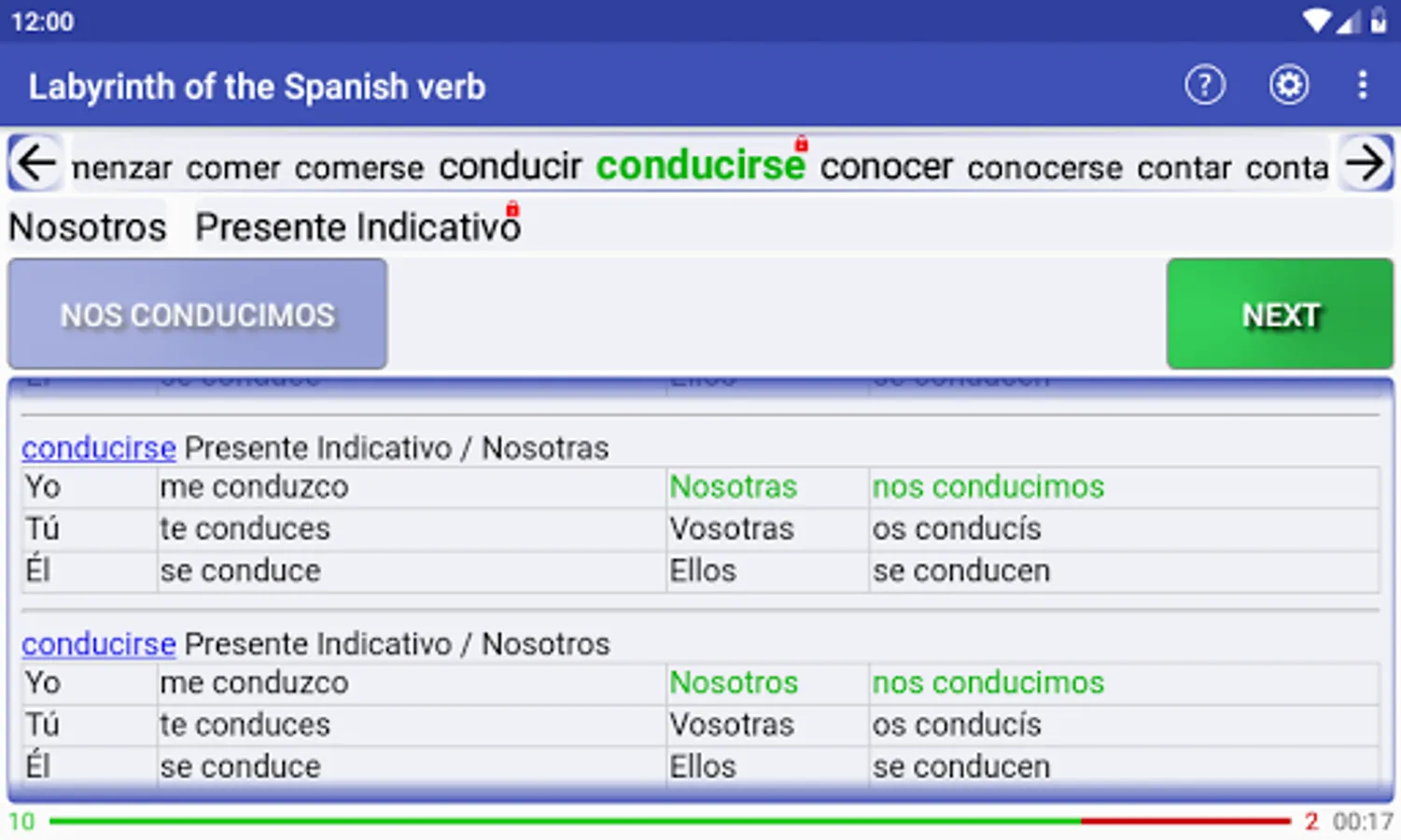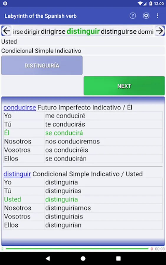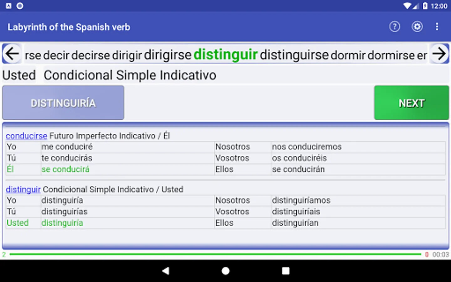 • Randomly chooses a verb, person, mode, time combination, presents three possible answers, one of them is correct