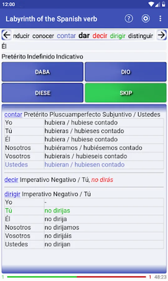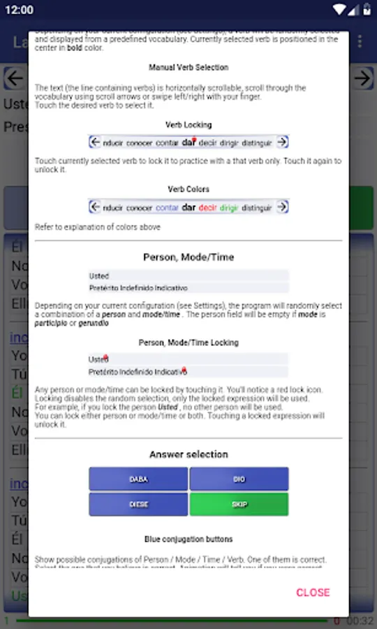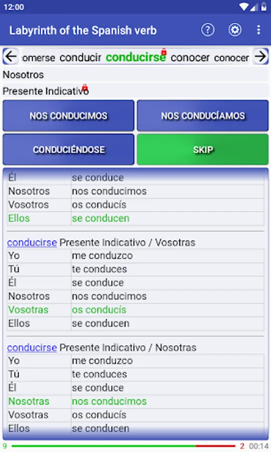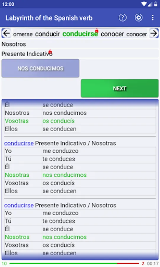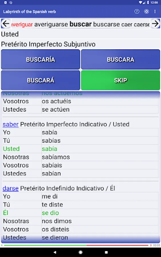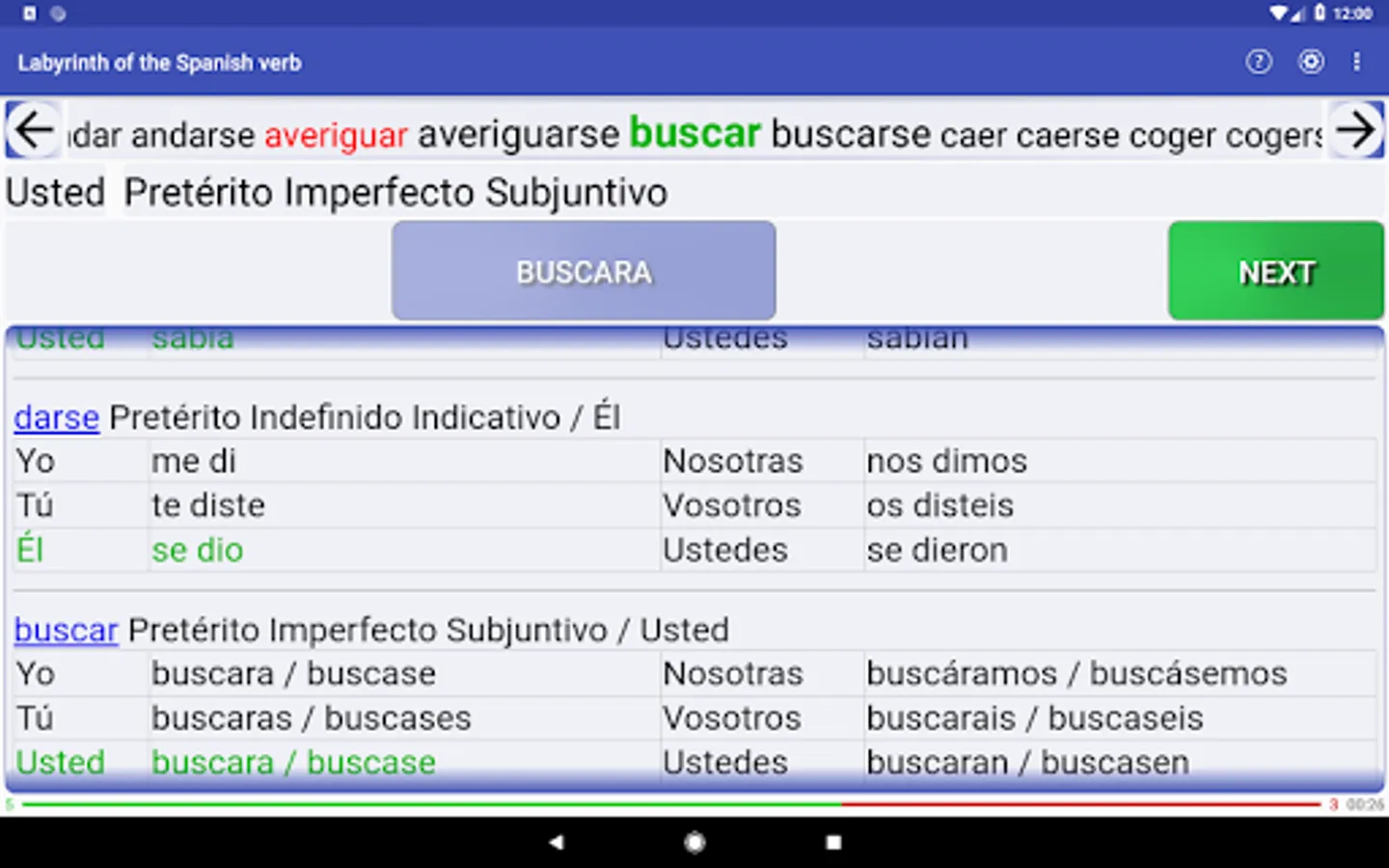 • Randomly chooses a verb, person, mode, time combination, presents three possible answers, one of them is correct