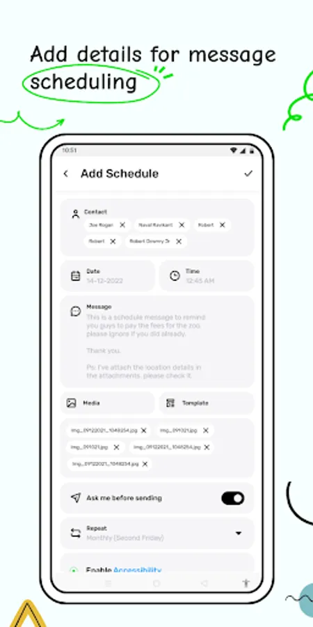 - Attach media files and creative message templates in reminder to save your time from typing