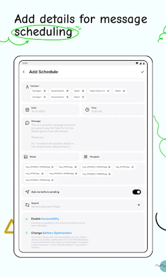 App takes SMS and calls log permissions from the user before proceeding with message scheduling to allow users to schedule messages.App uses Android Accessibility services to automate sending of messages created by the user and send messages on the user’s behalf at the scheduled time. ScheduleUp mimics user behavior on screen, sending automatically to all added recipients using Accessibility.