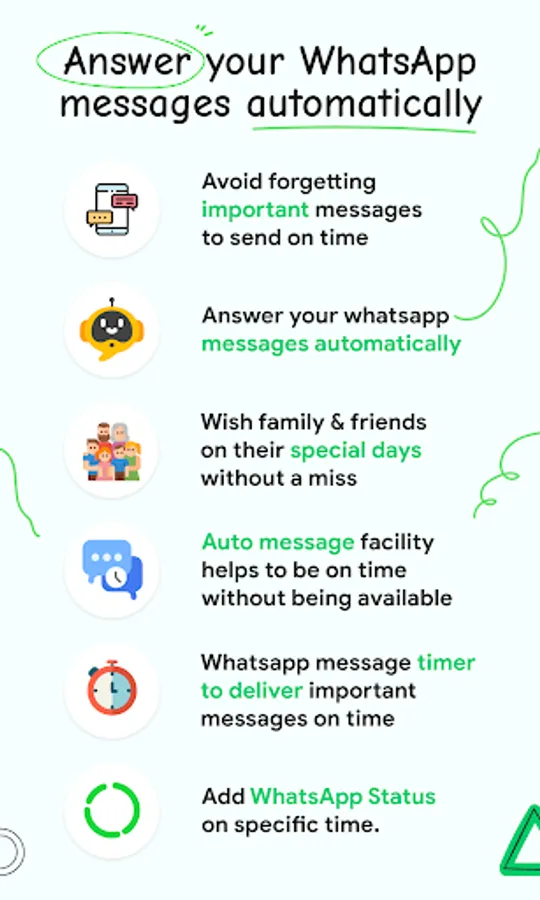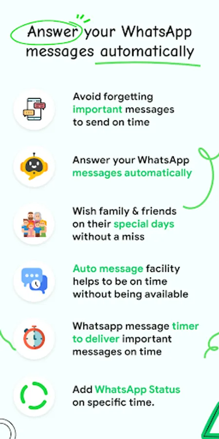 👋Your all-in-one assistant scheduler for WhatsApp messages, telegram messages, WhatsApp business messages, and SMS. The best and easy automatic reply scheduler for WhatsApp, telegram, WhatsApp business, Facebook Messenger.Easily plan multiple messages together. Now set "Reminder" with this scheduler for WhatsApp