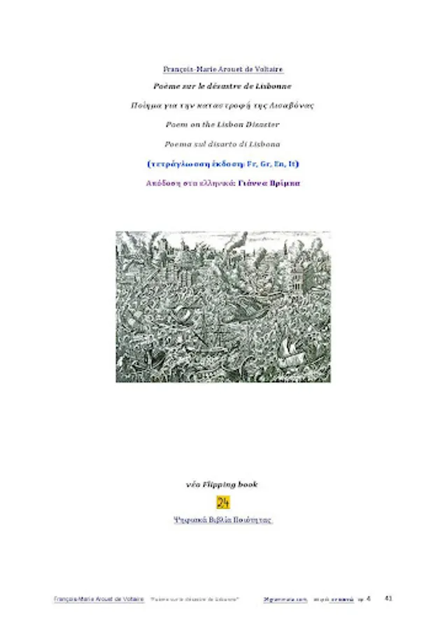 9:20 a.m., the day of All Saints for Catholics, an earthquake, now estimated to be of the order of 9 magnitude Richter, and the tsunami that followed killed 100,000 of Lisbon, ie half the population or 1 / 3 of the residents, then Portugal. The Lisbon was destroyed in an unprecedented historical times natural disaster that shocked Europe and was the cause of intense philosophical debates about the existence or not of divine providence in the world, the causes of human suffering and their interpretation. Through the storm positions and counter followed many questions raised and which directly challenged apologists of God presented him as the dominant medieval ecclesiastical power and abolished and the Order of Jesuits. The earthquake of Lisbon was an appalling fact, however, quickly subsided when the voices of the alleged divine punishment having lost any persuasive argument, and the catalytic intervention leaders capable as Prime Sempastiao de Mello, who is considered as the precursor of seismology and contributed significantly to the construction of buildings that can tolerate better in similar natural disasters, Portugal failed after a relatively short time to overcome the disaster to recover and attain modernized. Voltaire, the flagship this form of enlightenment, he wrote a few months after the "Poem on the Lisbon disaster", which contains many of the questions raised at that time on the occasion of the earthquake which had not ceased to trouble. .. George Primpas