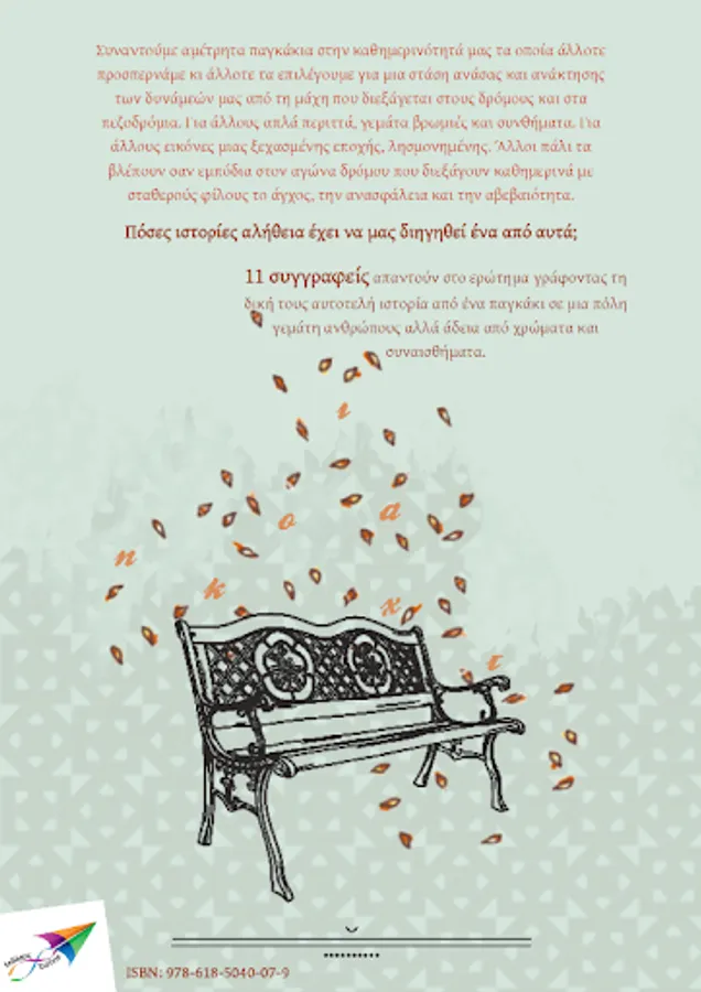 11 authors answer the question by writing their own separate story from a bench in a city full of people but empty of colors and emotions.