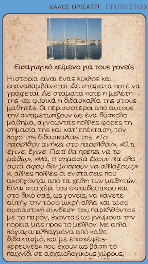 In simple words, free from didacticism, and visits-'investigations' that are based game in archaeological sites, monuments, museums and any other place that can "talk" to form at earlier times, the parent may and the teacher to unlock the gate of history in the minds of children.