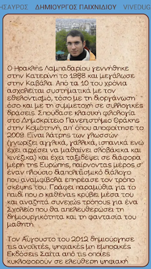 Hercules Lampadariou born in Katerini in 1988 and grew up in Kavala. From 10 years of dealing systematically with volunteering, both the organization and participation in collective action. He studied classical philology at the Democritus University of Thrace in Komotini, where he graduated in 2009.'s Fond of languages (knows English, French, Spanish and has started to learn Slovak and Chinese) and has traveled to various parts of Europe, taking part in a rich intercultural dialogue which undoubtedly influenced his way of thinking. Writes tales for the child that everyone hides and is constantly seeking ways for a school that will unleash the creativity and imagination of the student.