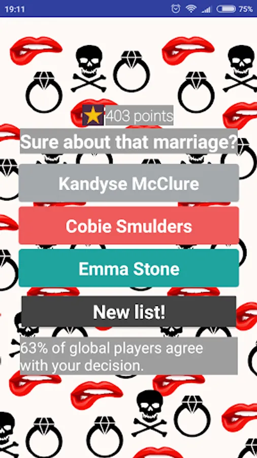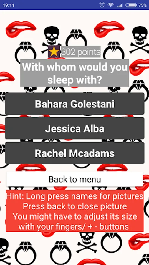 In this entertaining game, you are given three famous people, and the tough decision has to be made: you can sleep with just one of them once, you can marry another one, and the third one will kick you. After, your combination is compared with other players' decisions made around the world! If you are not sure about your decision, long press the person's name and a picture will open (requires internet connection).