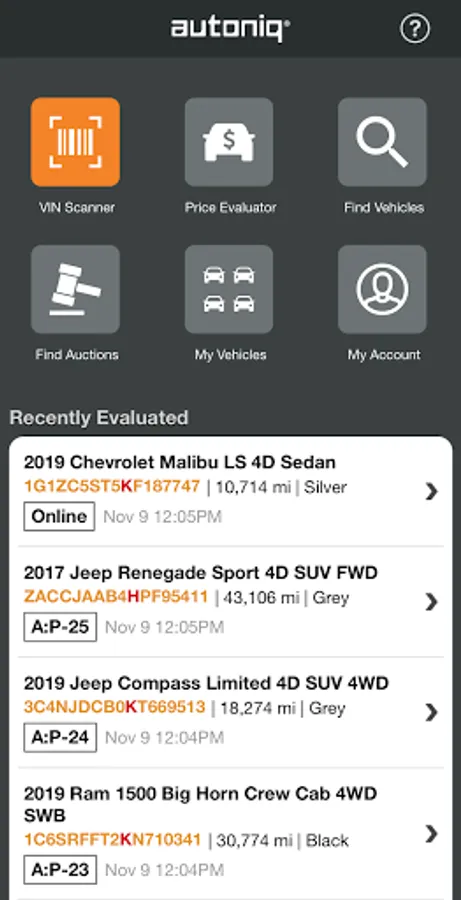 VIN SCANNER: autoniq’s VIN Scanner reads barcodes and QR codes so you can easily get accurate information on the spot whether it's at the auction or on the lot.