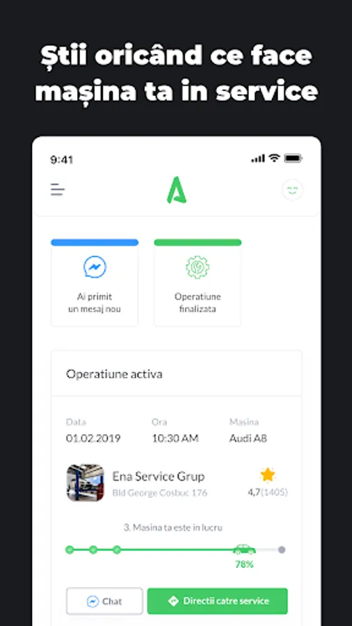 • Poți trimite mesaje, poze și documente service-urilor partenere prin intermediul chat-ului din aplicație