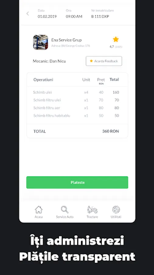 • Când lucrarea este finalizată, ești chemat la service să verifici mașina și poți să plătești direct din aplicație cu cardul