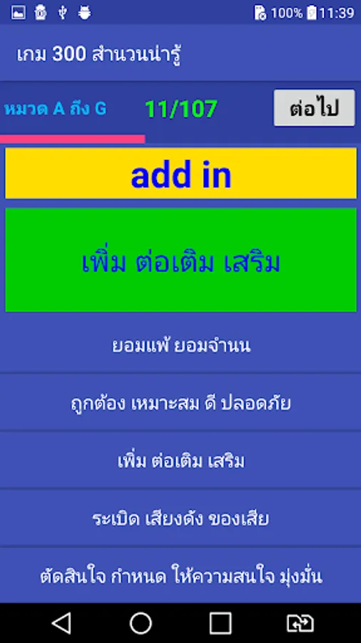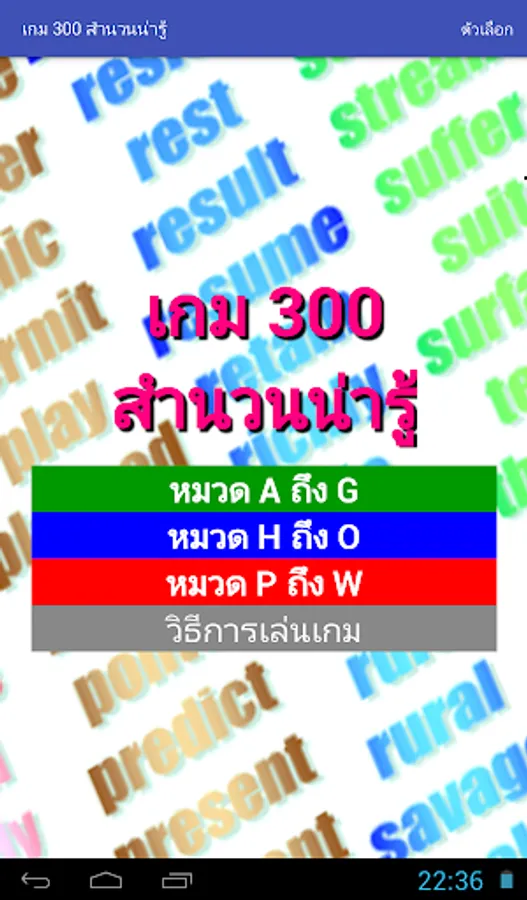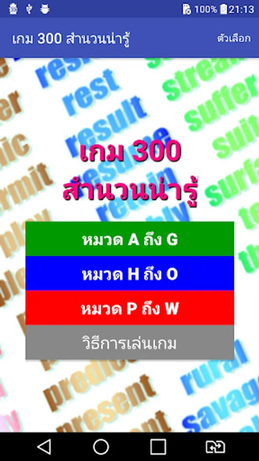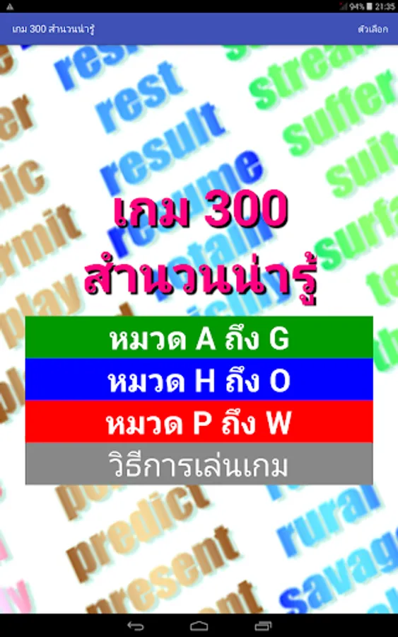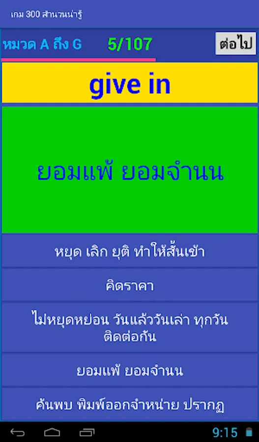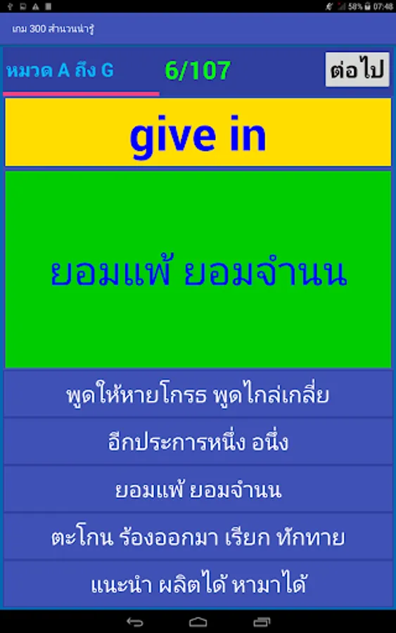 The game will randomly pick words out one word. The player must choose the correct translation within the time limit. It will score If the wrong answer Or answered late The game shows the correct translation. Allows players to remember The word that came to ask them in the future. Until the answer is all of