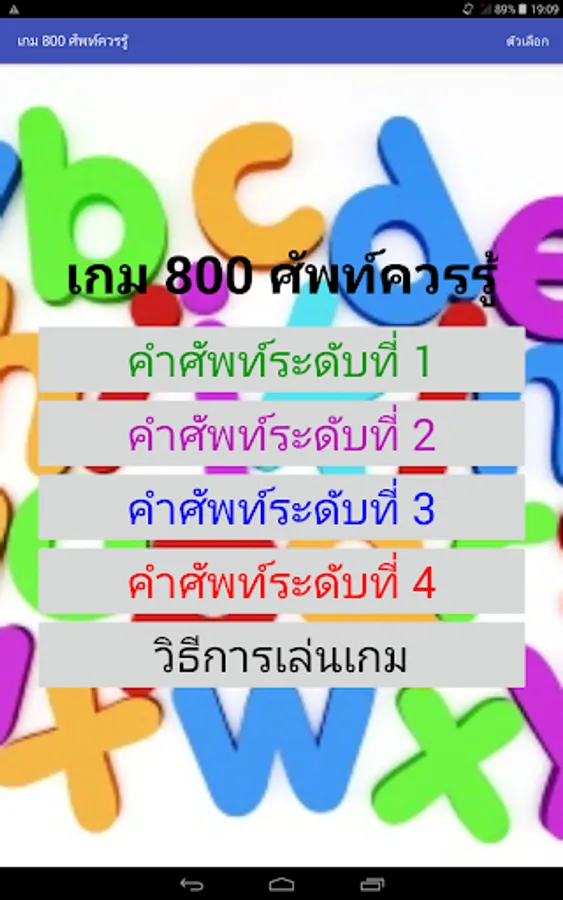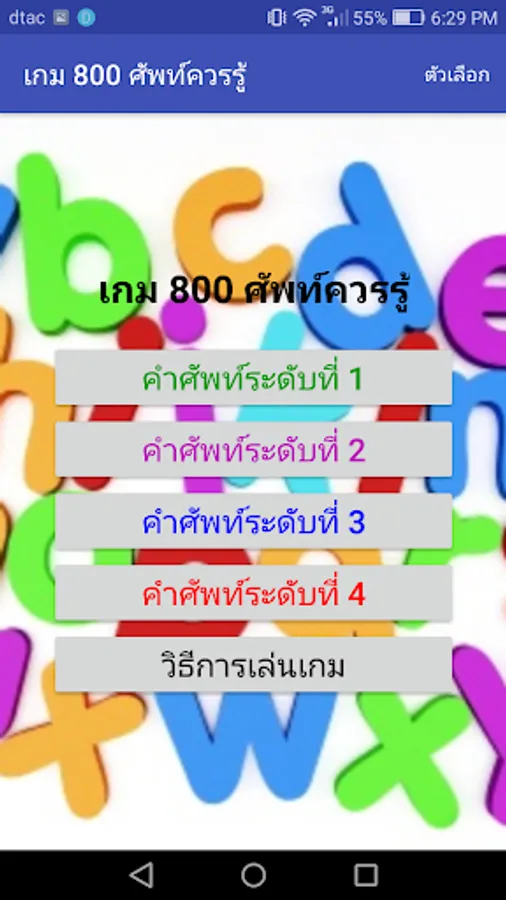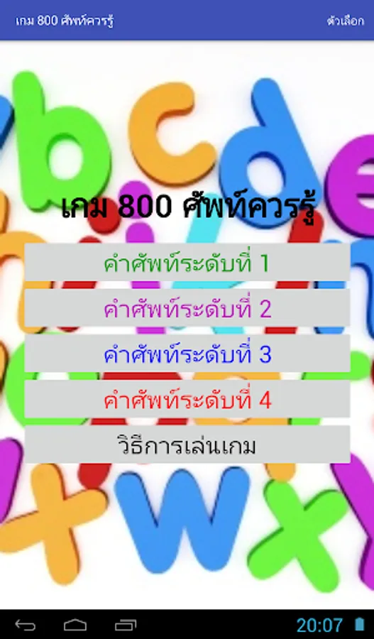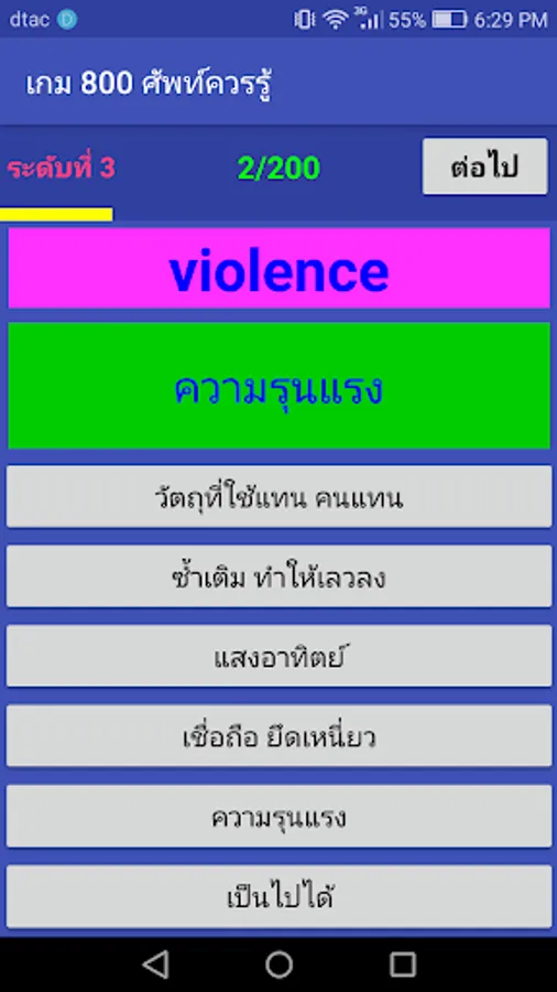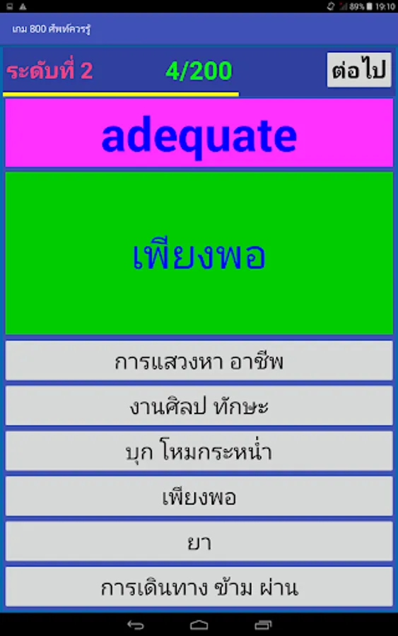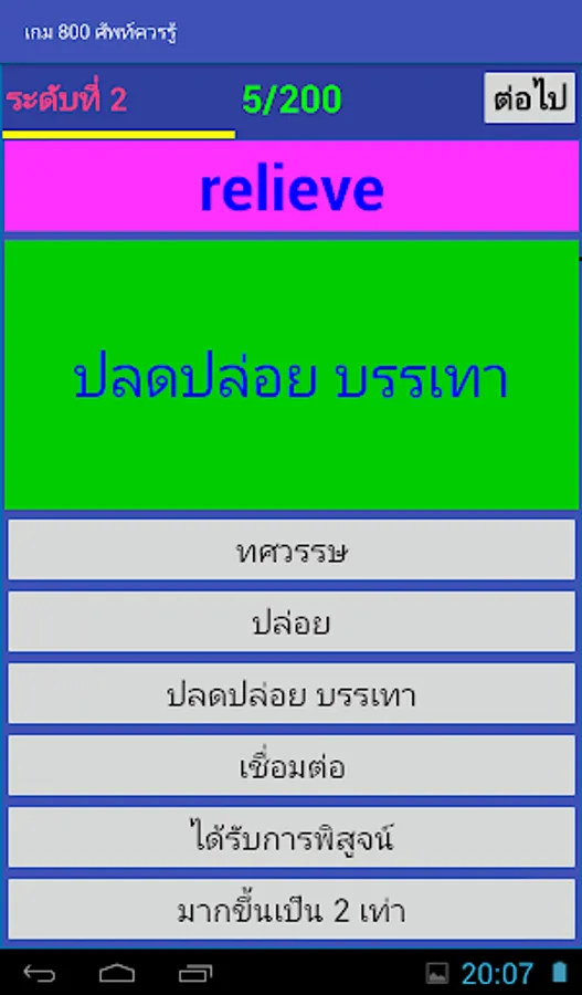 The game will randomly pick words out one word. The player must choose the correct translation within the time limit. It will score If the wrong answer Or answered late The game shows the correct translation. Allows players to remember The word that came to ask them in the future. Until the answer was 200 words.