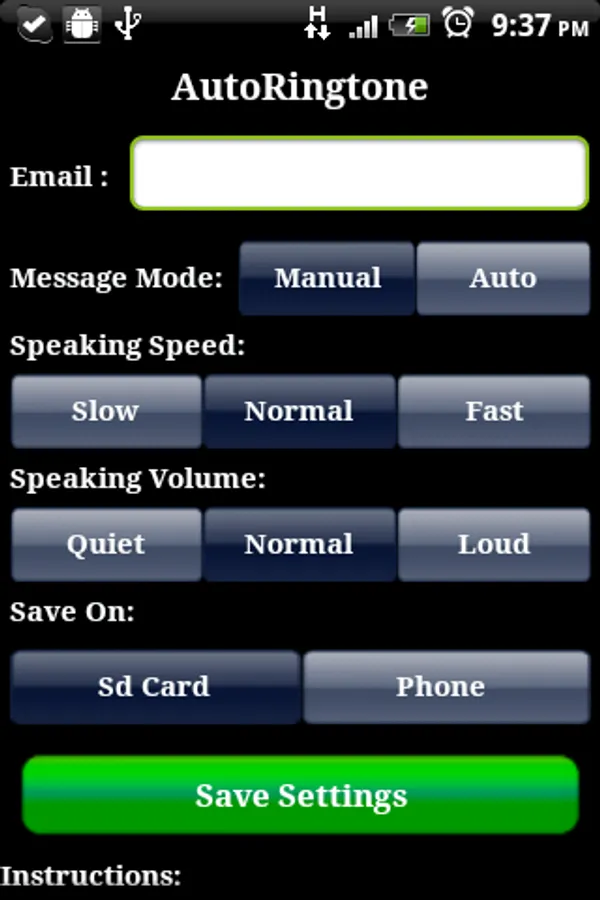 Type a unique ID (email address recommended but NOT REQUIRED), your name or greeting, a caller's name or title, select an optional Intro FX and a speaking voice. Touch Create and our server (Internet required) builds your custom ringtone and stores it. Retrieve ringtones at www.AutoRingtone.com by logging in with the same email address you entered in the app! This way, you can select which custom ringtones you like, and you don't have to worry about getting 100's of emails going to your spam folder!