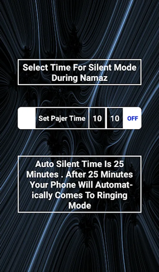 mints before the namaz time eg. Zohar namaz time is 1 : 30 the set silent mode time 1 : 25 or 1: 20 . then switch ON the ON/OFF button . If you want to Of the Time of silent mode then just OF the On/OF button .if this app is help full for you the share it with your friends and rate us.if you have any problem then contact us.