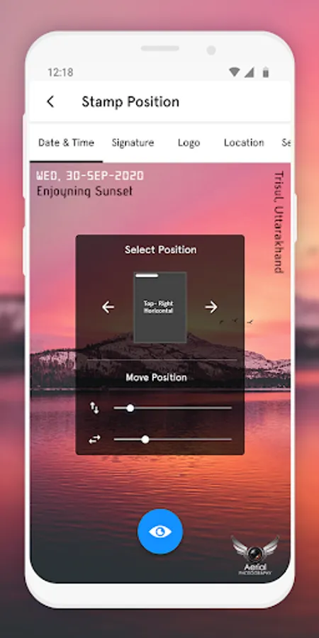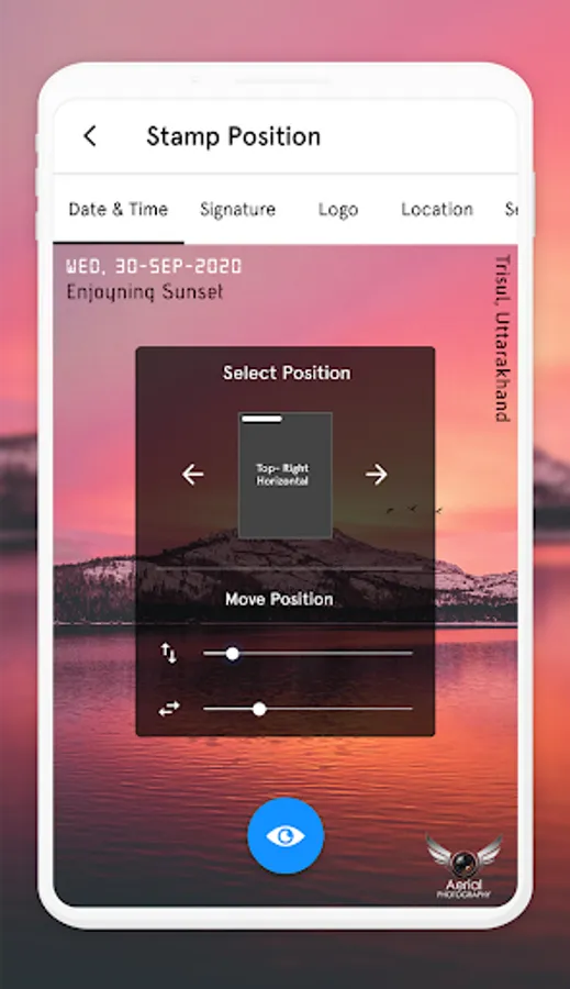 You can directly turn on/off Date and Time stamp, Location stamp, Logo stamp, Signature stamp on camera screen for stamper photo by clicking on stamp setting option.