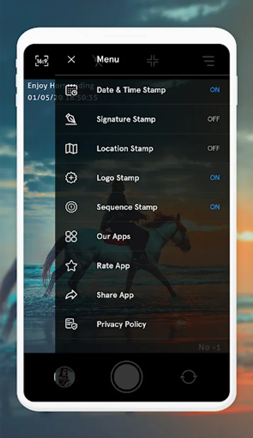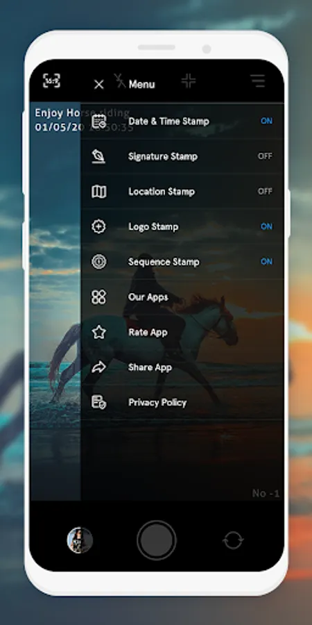 ➽ From Menu, you can ON/OFF Stamps that you require on your photos from Date stamper, Signature stamp, Logo Stamp, GPS location Stamp & Sequence Stamp.