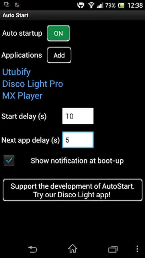 You can choose one or multiple apps to auto launch at boot. Autorun ( autoboot ) delays can be customized.