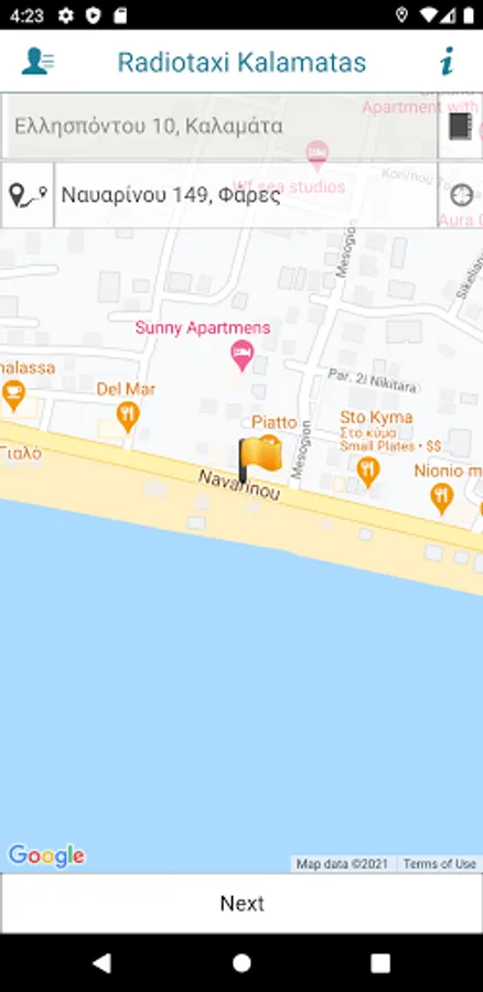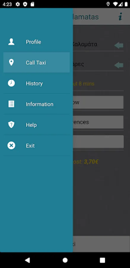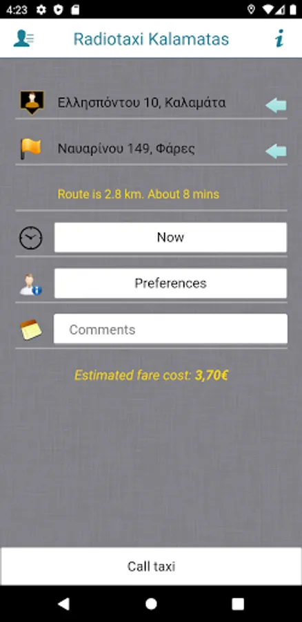The application is based exclusively on finding a taxi through the Kalamata Radio Taxi Cooperative.