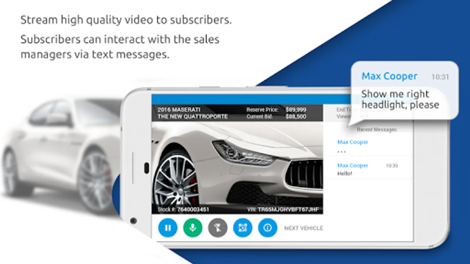 The application provides quick access to the vehicle from the list by using the filters. It allows streaming high-quality video to subscribers. Sales managers have the possibility to broadcast several video streams for one vehicle at the same time. Subscribers can interact with sales managers via text messages. For the watcher’s comfort, a presenter is able to adjust the camera focus and the flash to improve the image quality. The video can also be muted. A presenter can quickly switch to the next vehicle with one tap.