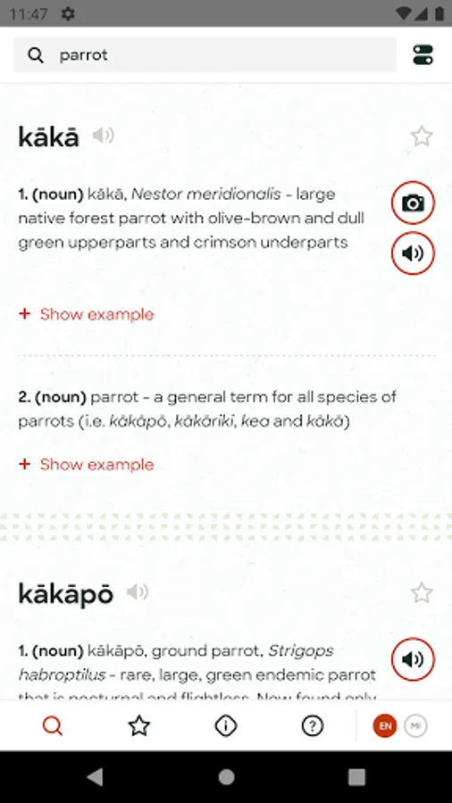 As well as English meanings, it has example sentences with translations for many entries. It even has photographs and audio clips for Aotearoa/New Zealand native fauna and photographs of flora, important people and other items where a photograph will aid understanding.