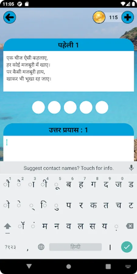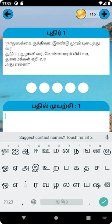 The game provides you with the opportunity to test your Tamil / Hindi writing skills as well, as it expects you to enter Tamil/ Hindi riddle answers in Tamil / Hindi !!