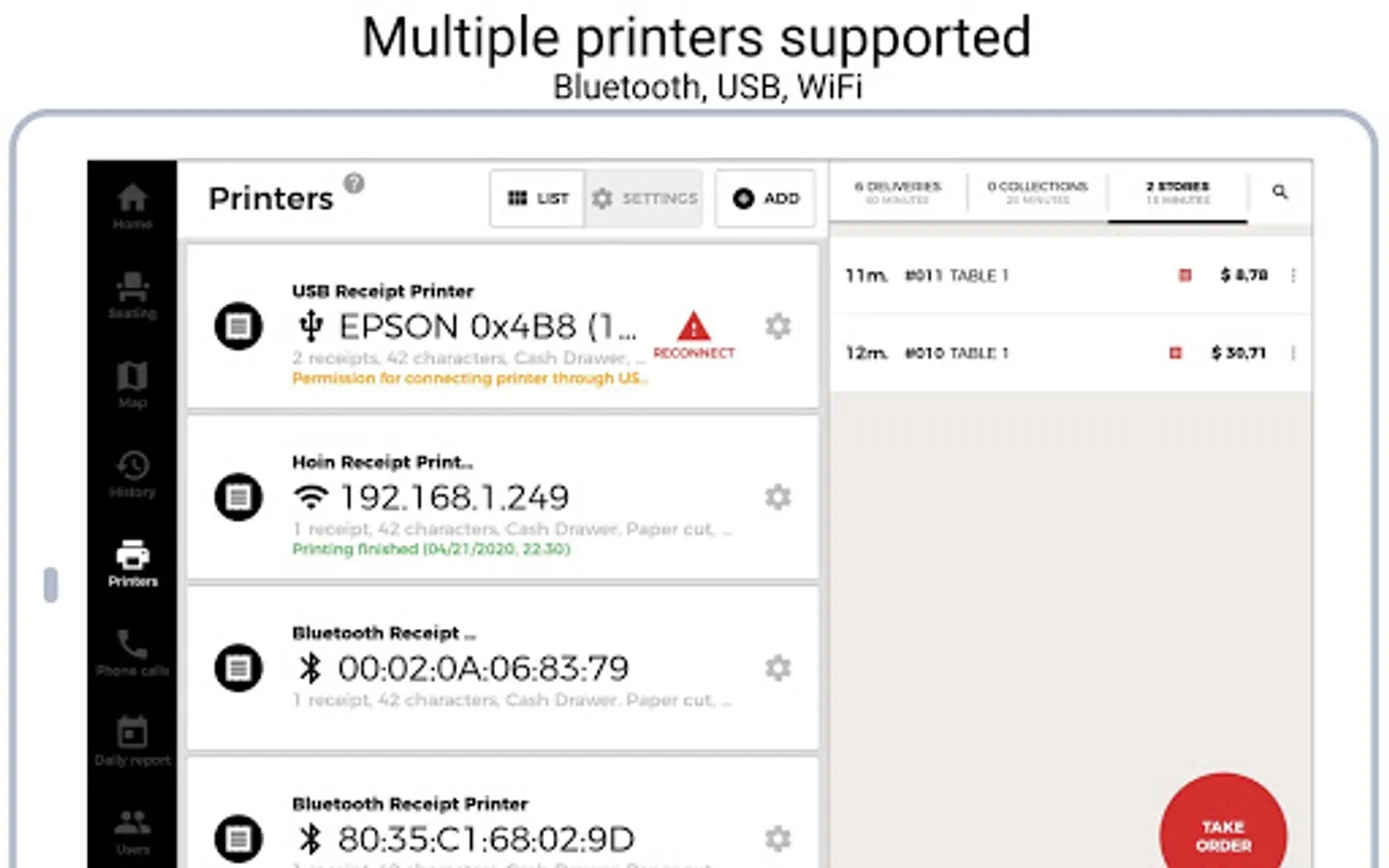 • Printers supported: Aures, Epson, USB printers, Atol, Datecs, Zebra, Star, Bixolon, Brother, Honeywell, Seiko, Citizen, Cashino, XPrinter, Bluetooth printers, Esc/POS
