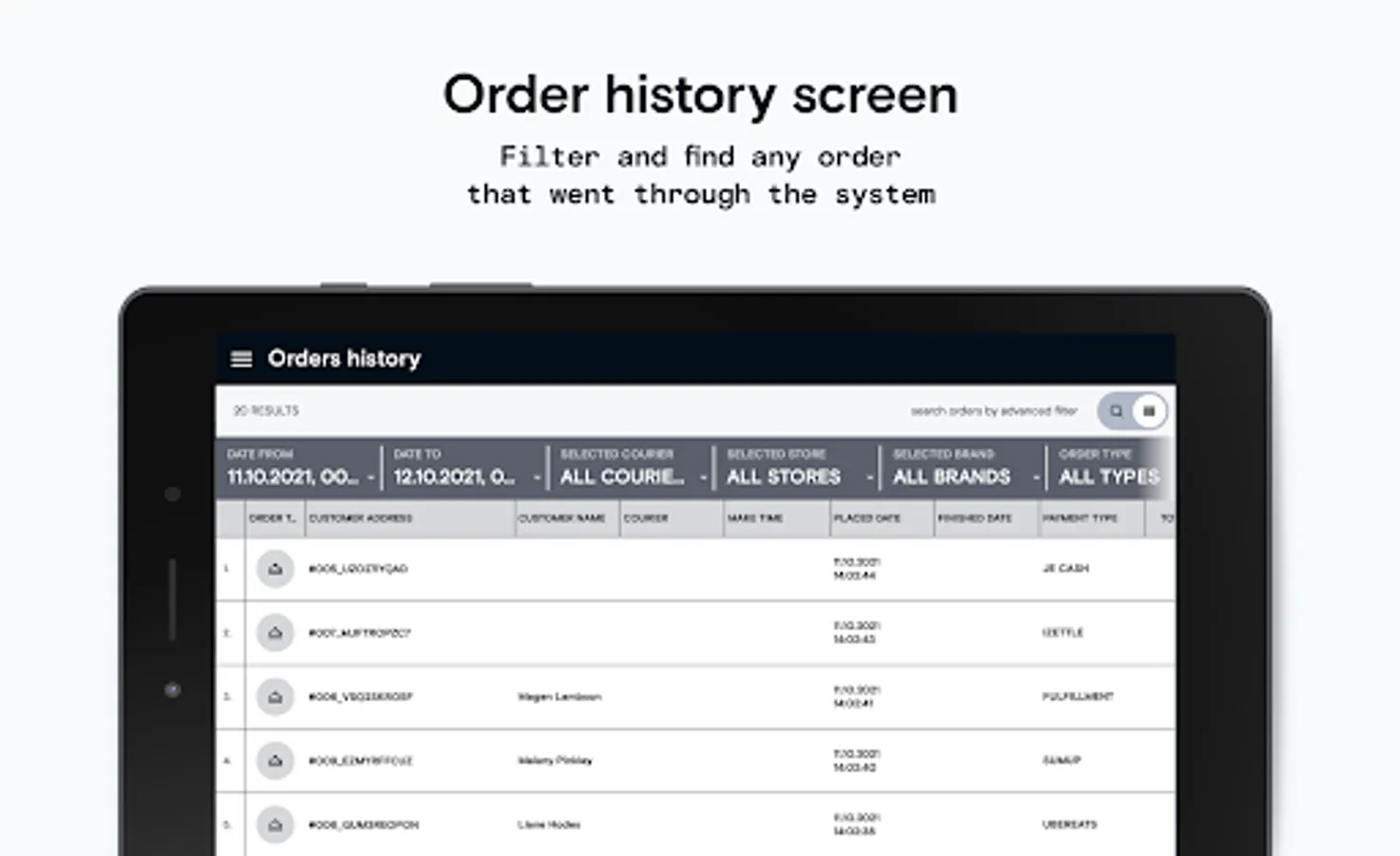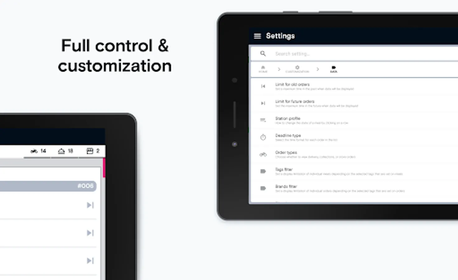 • Filtering orders/foods by tags (like pizza, spicy kitchen, meats...), brands, order types, etc.