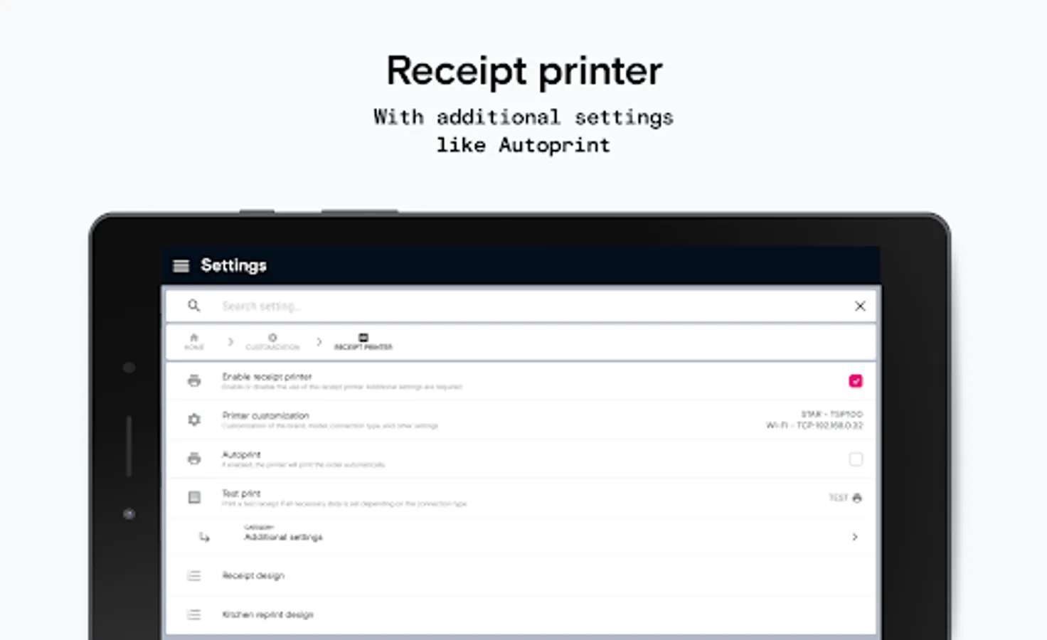 • Printers supported: Aures, Epson, USB printers, Zebra, Star, Cashino, Bluetooth printers, Esc/POS