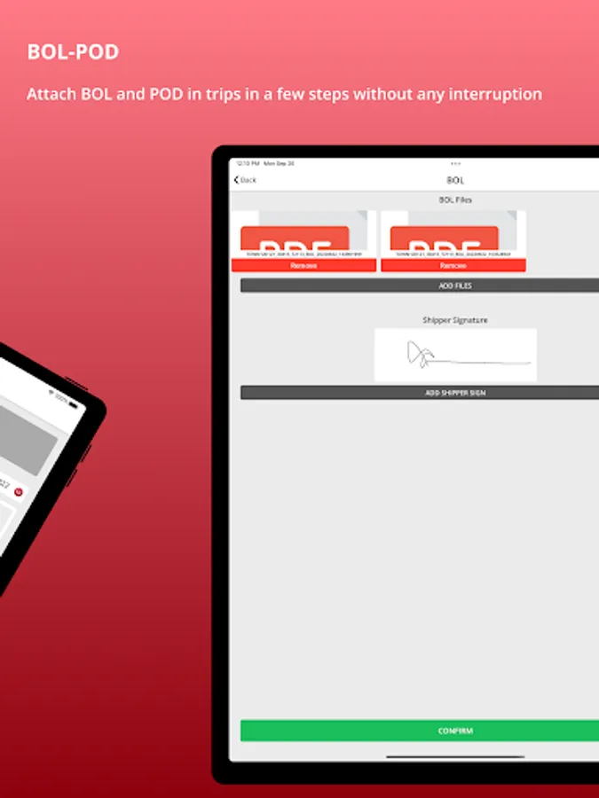 • Drivers can attach documents or pictures to the trips, which will be immediately available in AED. PODs and BOLs are automatically linked to the related order in Avaal Express Dispatch software.