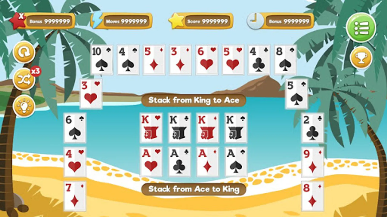 If all of these options are exhausted, then the option to pull all bottom cards from all stacks within the Tableau and place them on the top of each pile is available. This can be done by pressing the button between the undo and hint on the left side of the game.