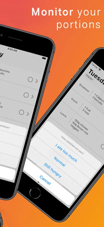 Dieetly will ask you 3 questions each time you mark a meal as completed. Those questions will help you becoming aware of your stomach fullness. After a few weeks, you will start feeling when it's time to eat and when it's not by just listening to your stomach.
