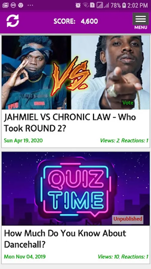 Allows users to participate in trivia question and answer quiz, cast your votes about dancehall