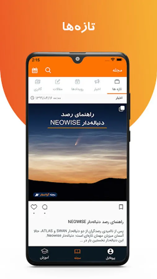 Avastar Magazine includes news and news analysis sections, articles written and translated by current articles, astronomical calendar, training and exam courses, amateur astronomy workshop, work with astronomical tools, astronomical image gallery, announcement of programs of Iranian astronomical groups and centers, and so on.