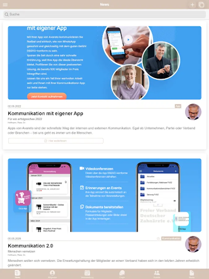 Organize your association and club life completely digitally: management of all member data, creation of project groups, organization of events with confirmations and cancellations, individual, group and organizational chat, provision of documents, public photo pin board and much more...