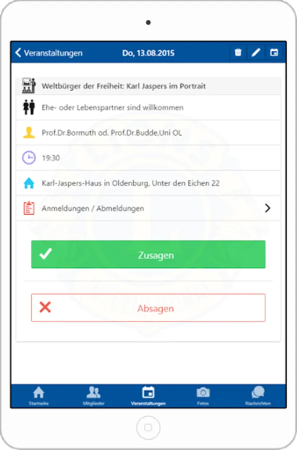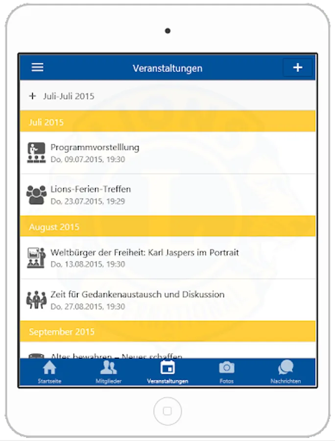 Informs you about the current events program and all members contact data. With the LionsApp the members can Events Toggle u from anywhere and at any time. sign out. The Board may at any time in the app the current list of participants.