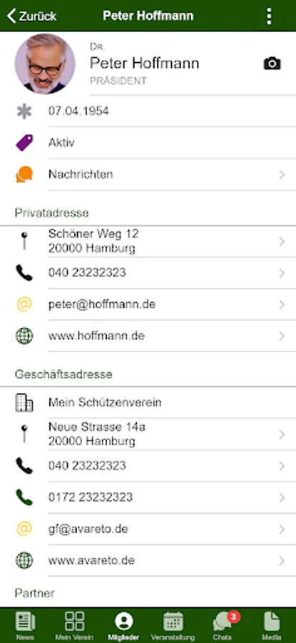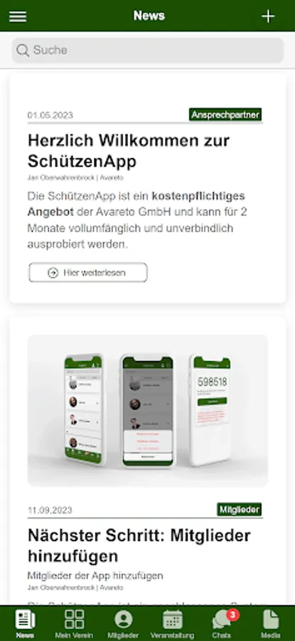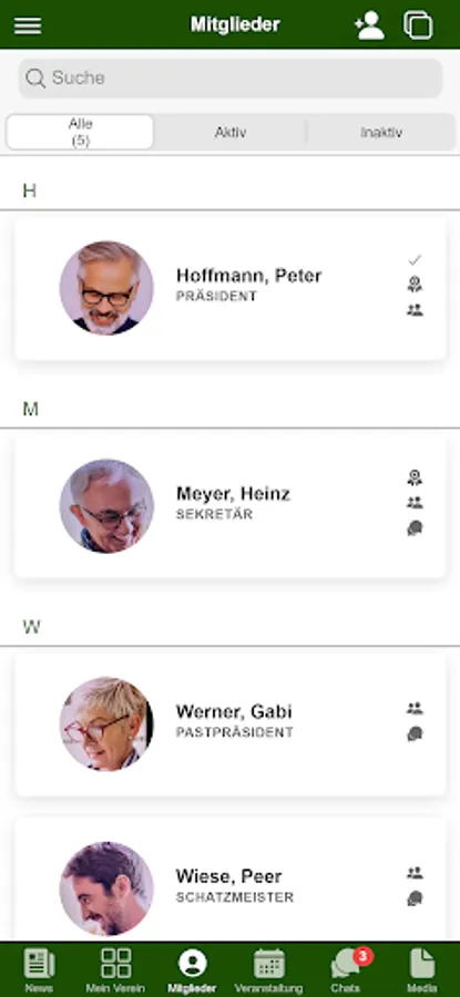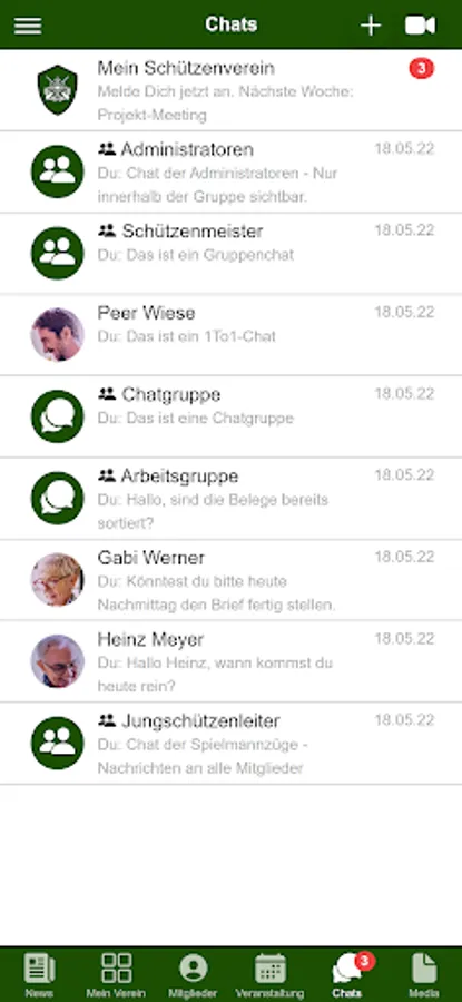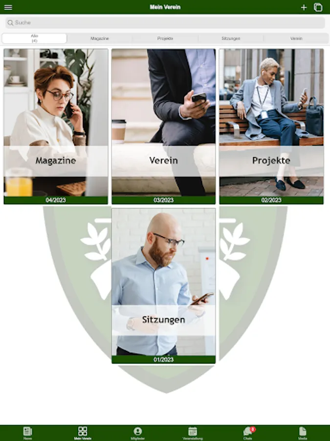 Communication of news and member magazines, management of all member data, creation of project groups, organization of events with acceptances and rejections, individual, group and organizational chat, provision of documents, public photo pinboard and much more...