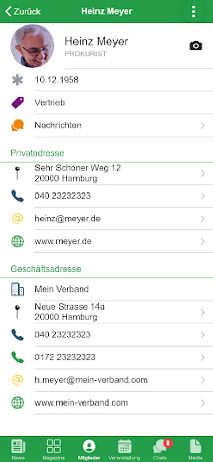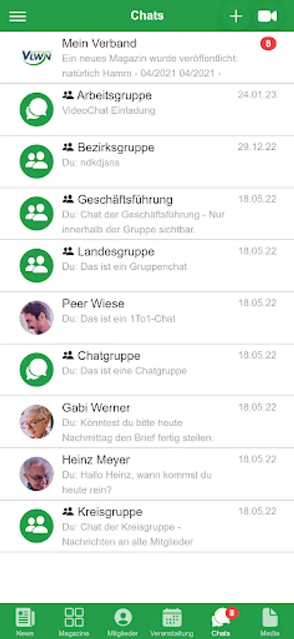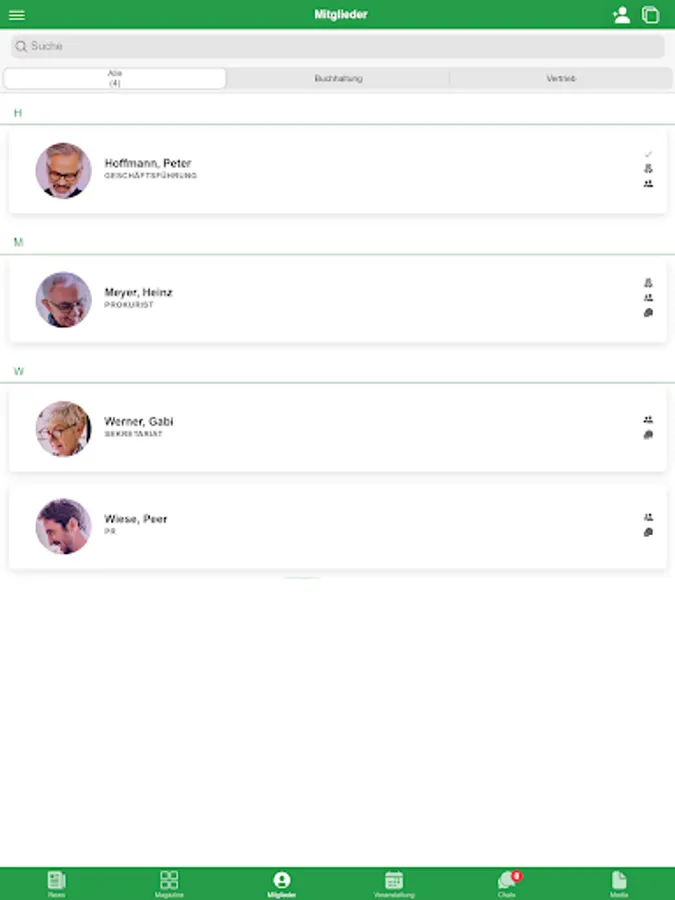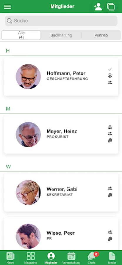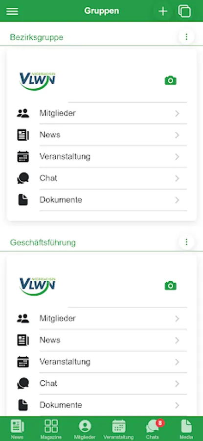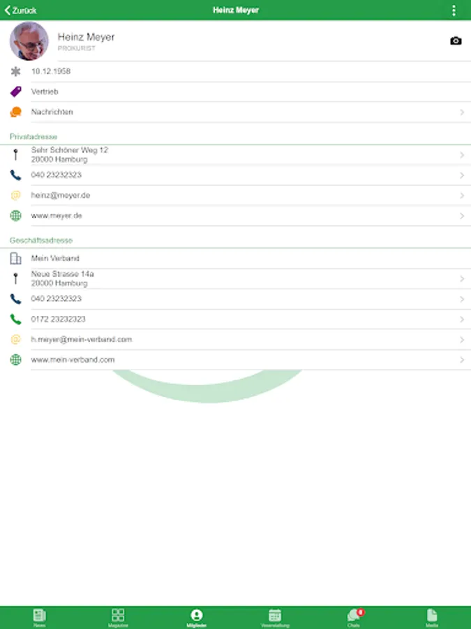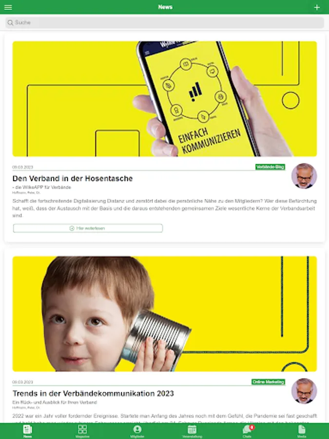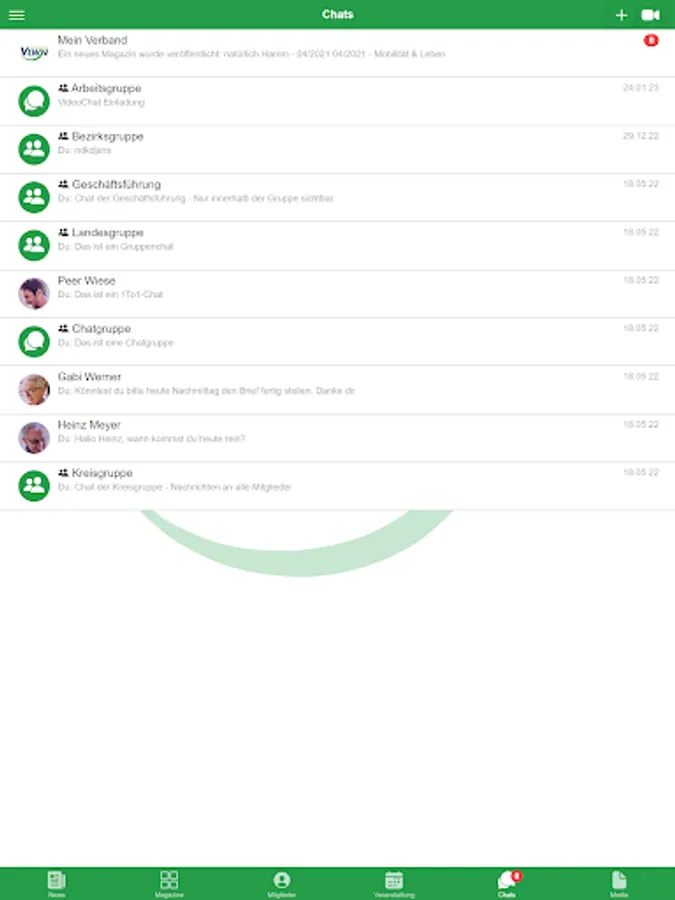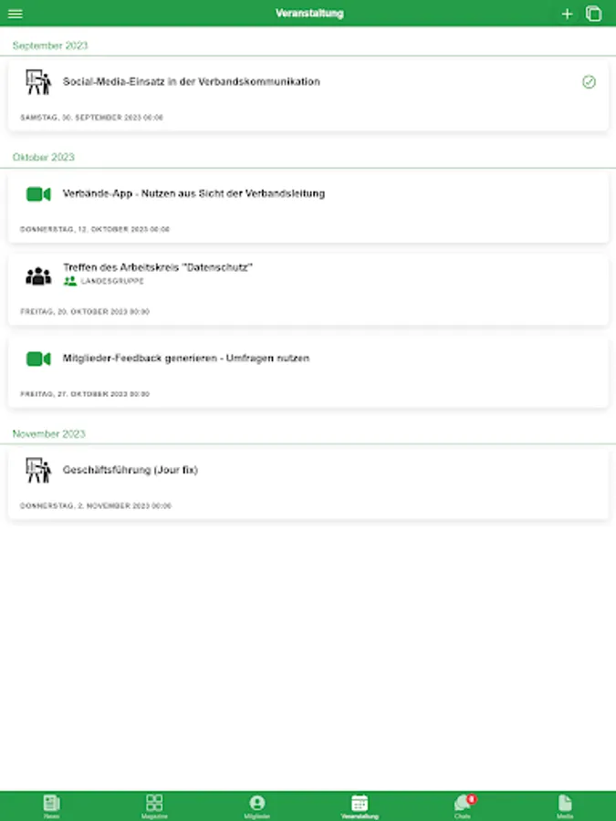 Organize your association life fully digitally: communication of news and member magazines, management of all member data, creation of project groups, organization of events with acceptances and cancellations, individual, group and organizational chat, provision of documents, public photo pinboard and much more.. .