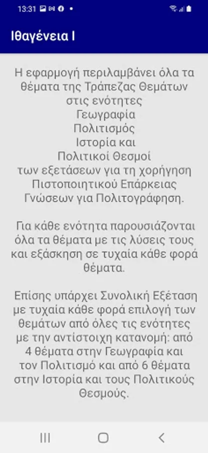 The application includes all the topics of the Theme Bank in the sections: Geography, Culture, History and Political Institutions, of the exams for the issuance of a Certificate of Proficiency for Naturalization.