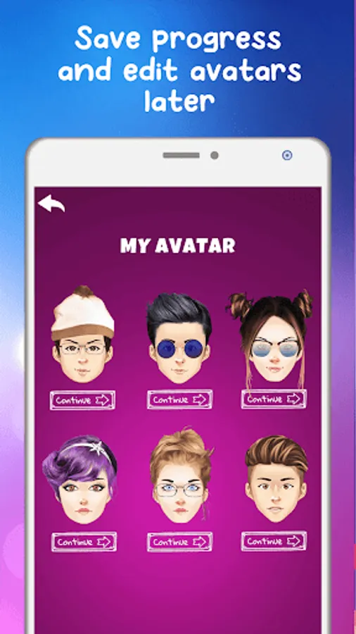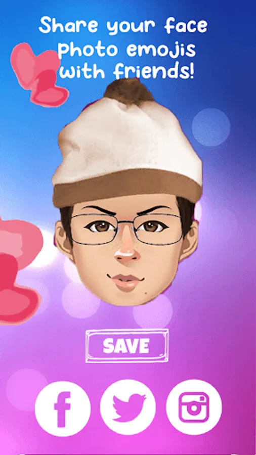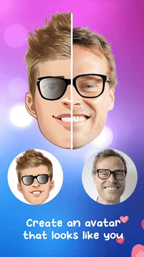 Create avatars that look like you, your friend or a family member. Make characters boys and girls. Choose face shape, lips, nose, eyes and eye color, eyebrow shape and color, hairstyles and hair color, eyeglasses, sunglasses. Save your creations, save progress and continue later. Download images and share pics as emojis!