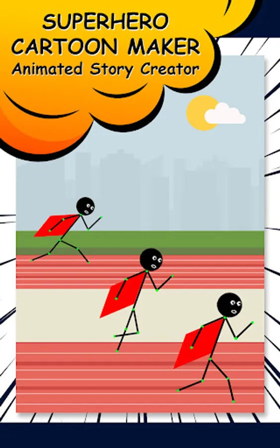 Our superhero cartoon maker encourages you to create animated story by using your imagination and improve your creativity skills. Our app provides different situations for your superman and set targets like fire in the city and one girl need help in that situation your animated stickman help her, your superman is Athletic and your animation creativity help him to win the race.etc...