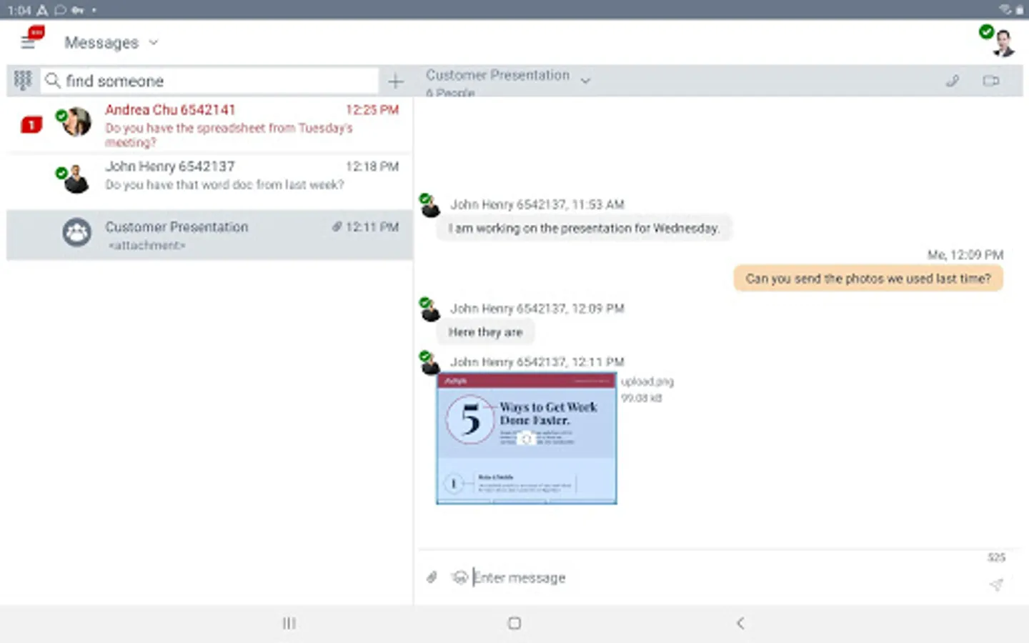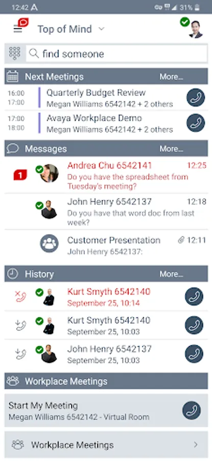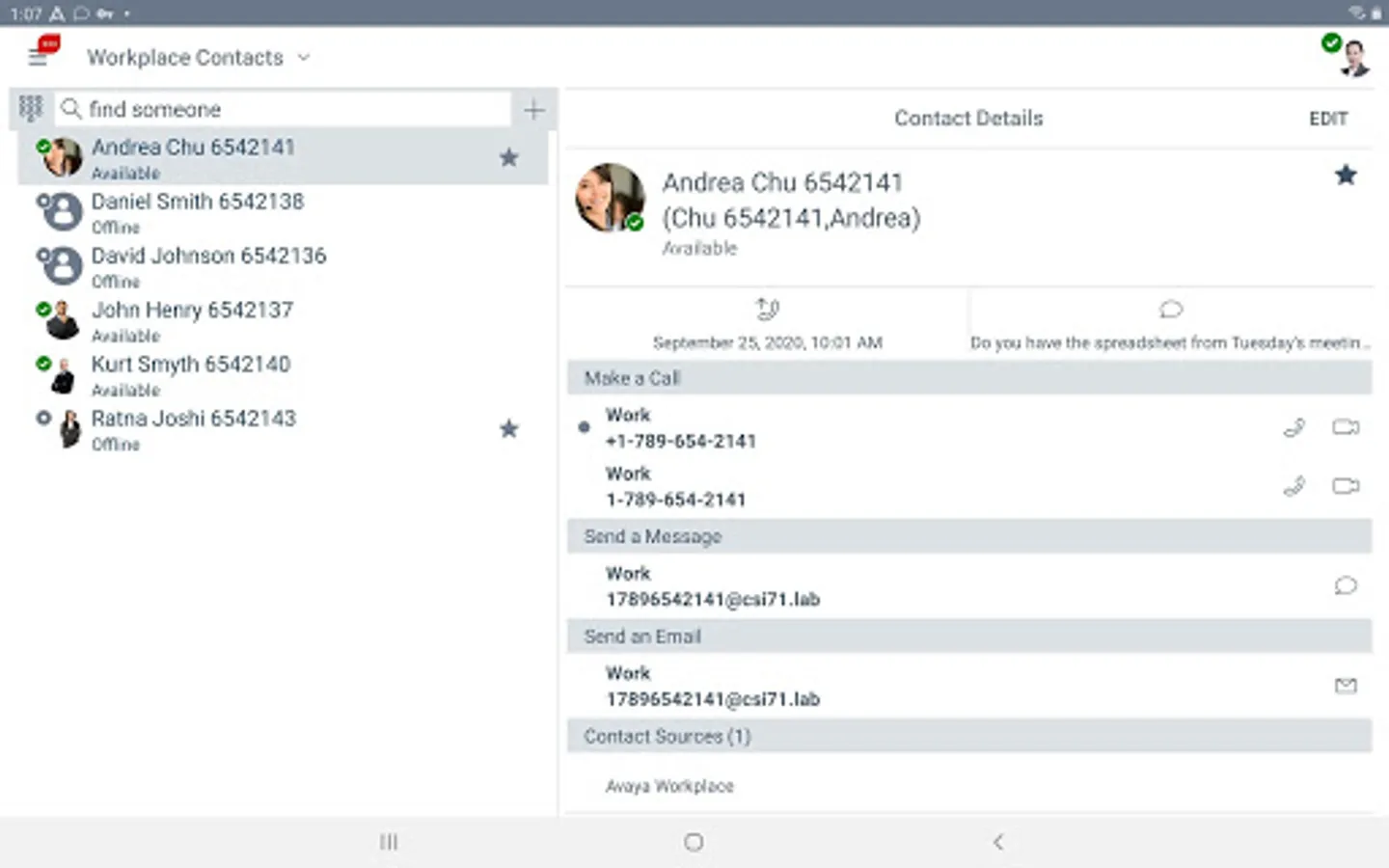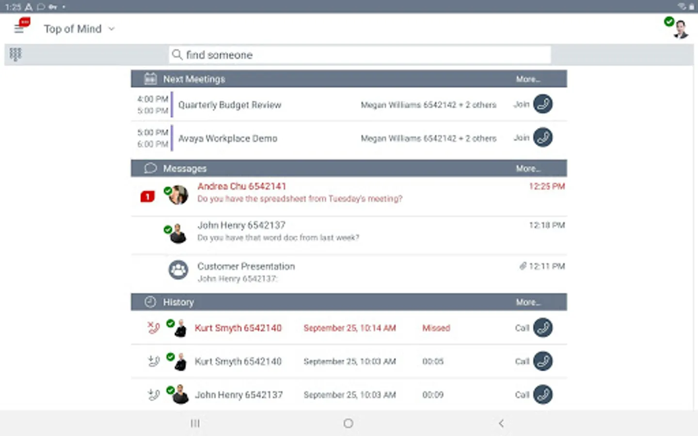 Avaya Workplace™ integrates your Android device with your office Avaya Aura® communications environment and delivers mobile voice & video VoIP calling, cellular call integration, rich conferencing, instant messaging, presence, visual voicemail, corporate directory access and enterprise call logs.