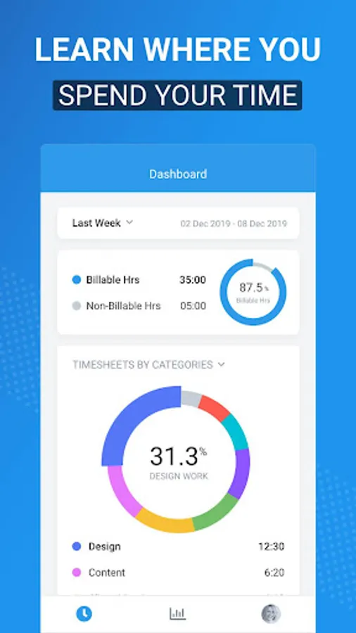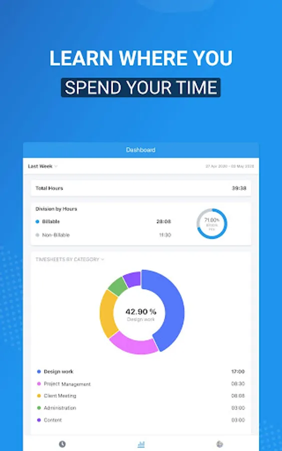Gain meaningful insight into your time with the beautiful dashboard. For your selected time period see a breakdown of billable vs non-billable hours and group time by customers, projects, timesheet categories and more.