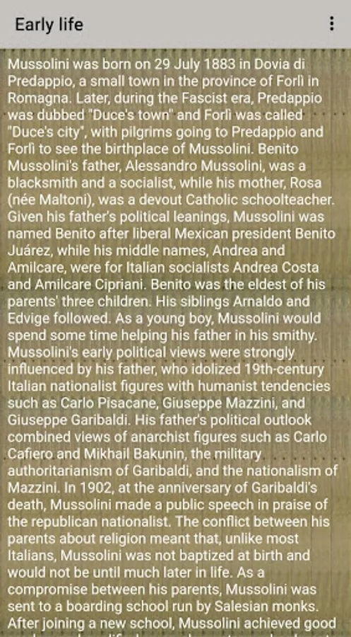 Mussolini was born on 29 July 1883 in Dovia di Predappio, a small town in the province of Forlì in Romagna. Later, during the Fascist era, Predappio was dubbed "Duce's town" and Forlì was called "Duce's city", with pilgrims going to Predappio and Forlì to see the birthplace of Mussolini.