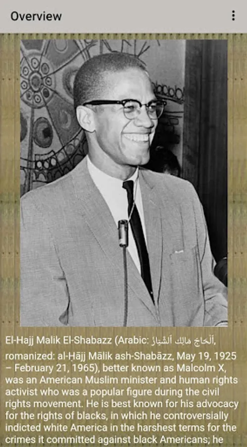 Malcolm X was an African American civil rights leader prominent in the Nation of Islam. Until his 1965 assassination, he vigorously supported black nationalism.