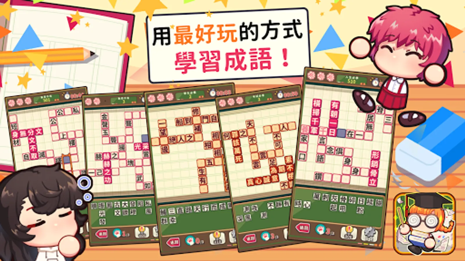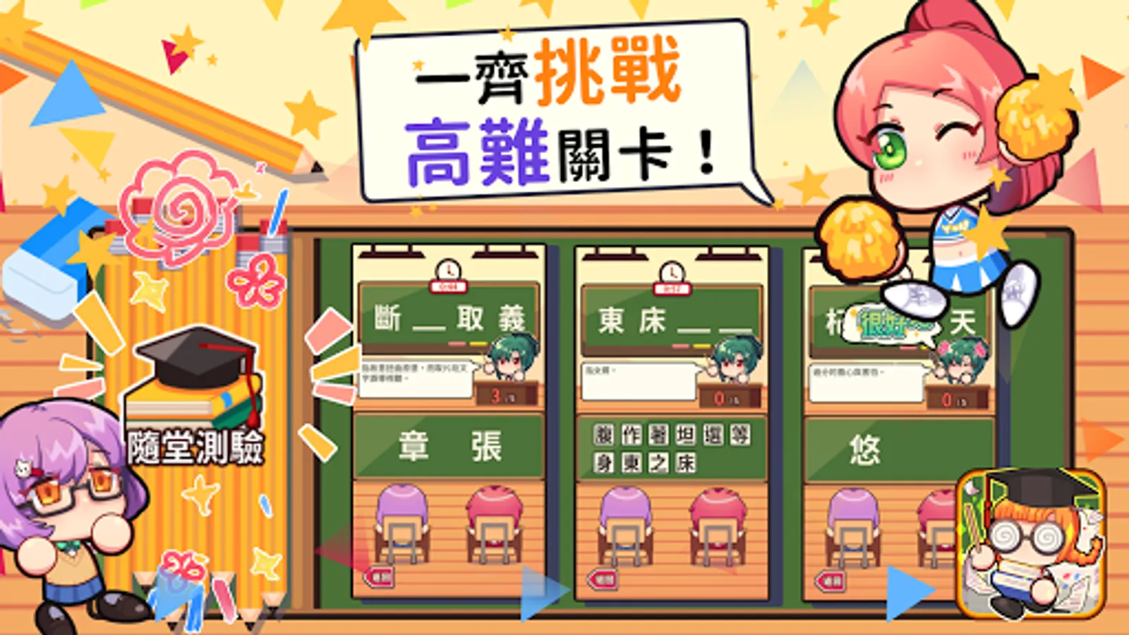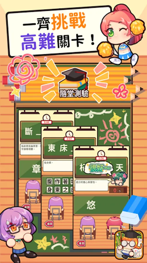 Come into the classroom! Did the teacher listen carefully in class? XD! Learn idioms happily and increase the database of brain idioms happily. You can also use mini games to enhance memory; of course, you can also compare each other to see whose idioms are more knowledgeable! The game is divided into five levels, and there are scoring, correctness, and cat print rankings. Among them are the most standard idioms of the Ministry of Education, and the most difficult idioms from ancient times to the present. Come, come and challenge.