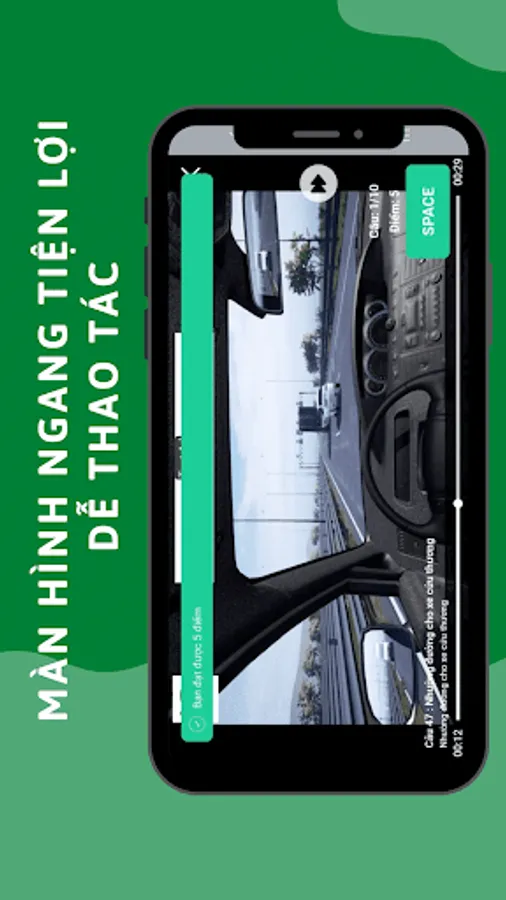 - Chương 5: Giao thông trên đường quốc lộ (17 câu) gồm các tình huống thực tế như xe dừng đột ngột chết máy, phương tiện đi sau xe chở cồng kềnh, sang đường nguy hiểm, phương tiện tránh chướng ngại vật,...