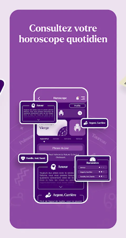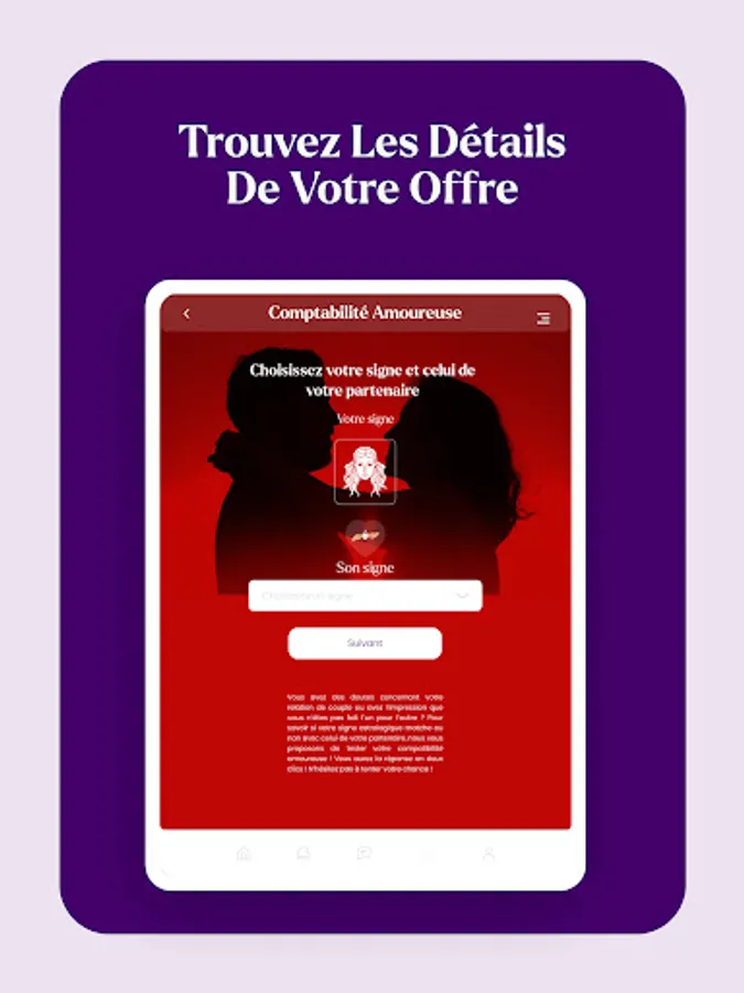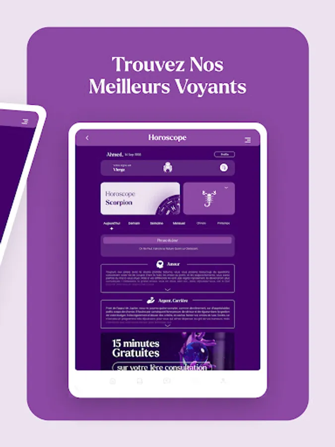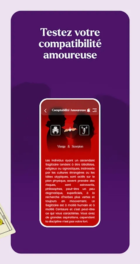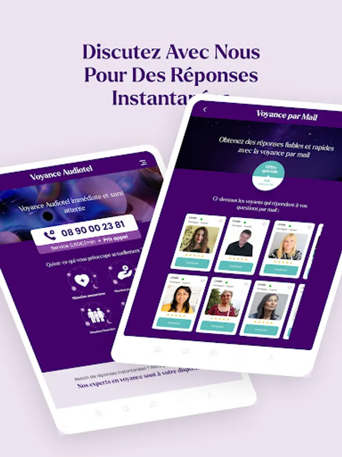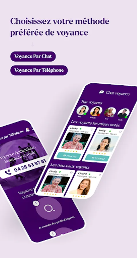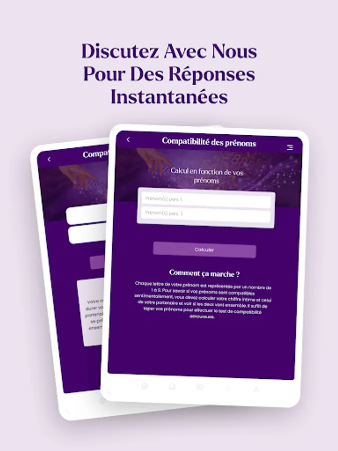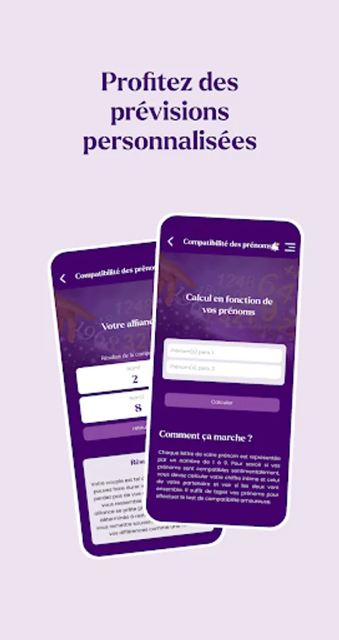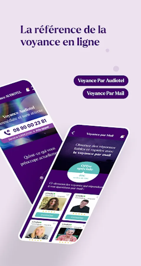 Our application also integrates clairvoyance by chat, numerology, tarology, love accounting, first name compatibility and horoscope to offer you a complete and personalized experience.
