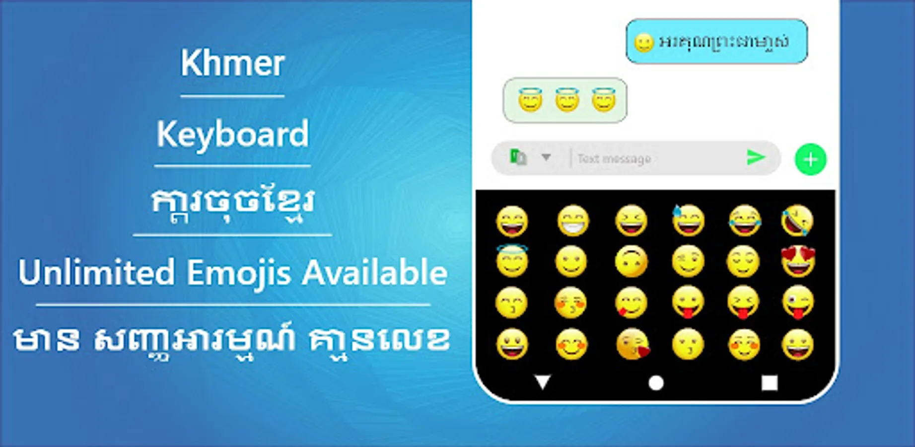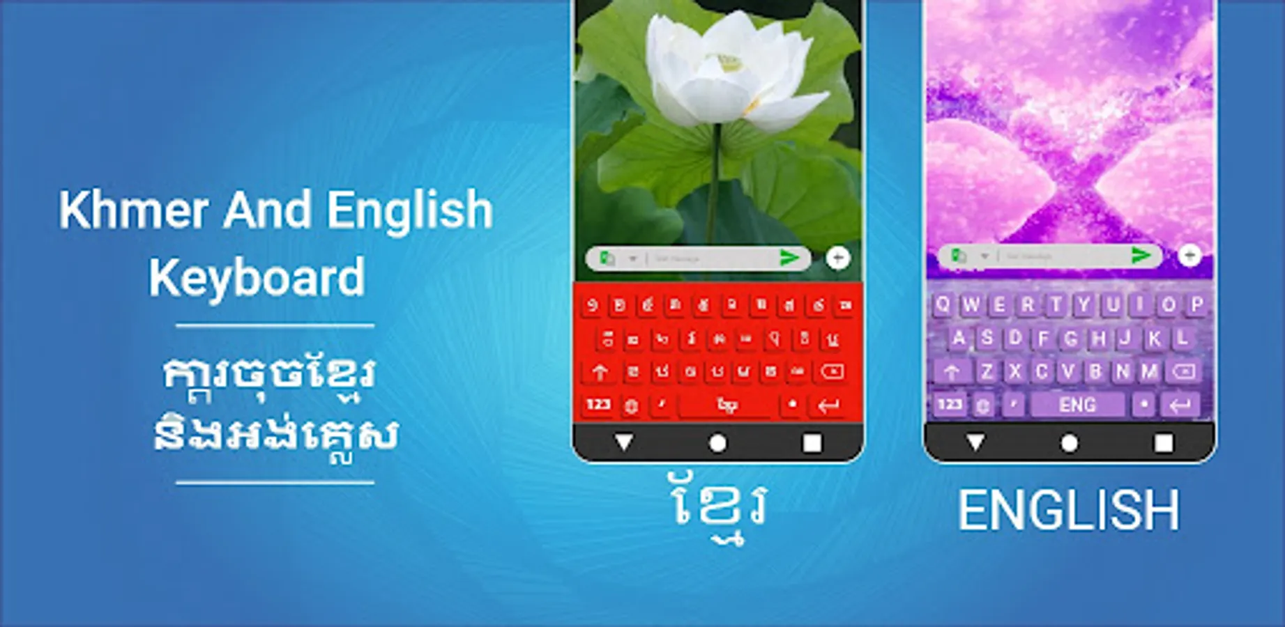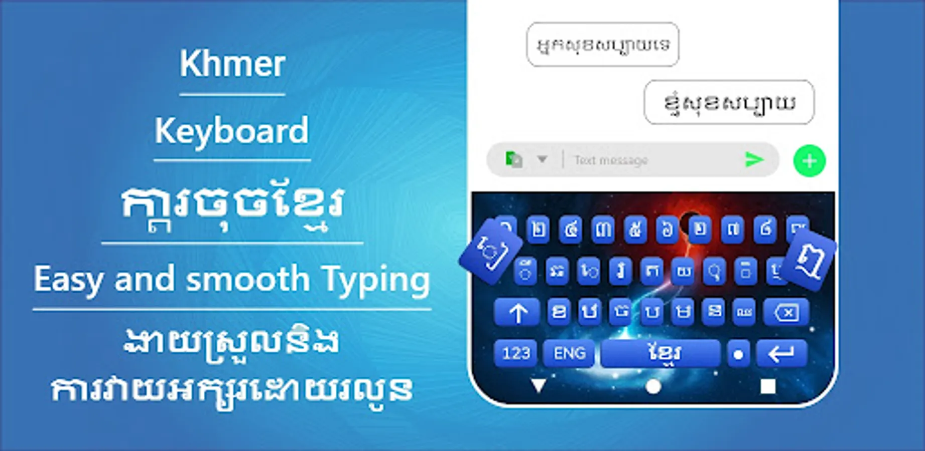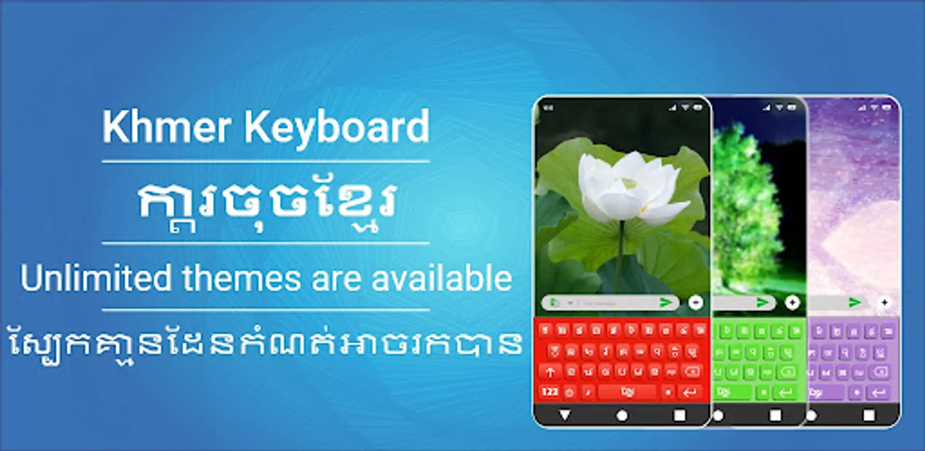 Easy Khmer keyboard and typing Khmer works in dual way. You can type in English as well as in latest Khmer Keyboard. Smart & unique Khmer English keyboards have a variety of features. It has themes in different colors. Auto text Khmer keyboards help you a lot while talking to friends.